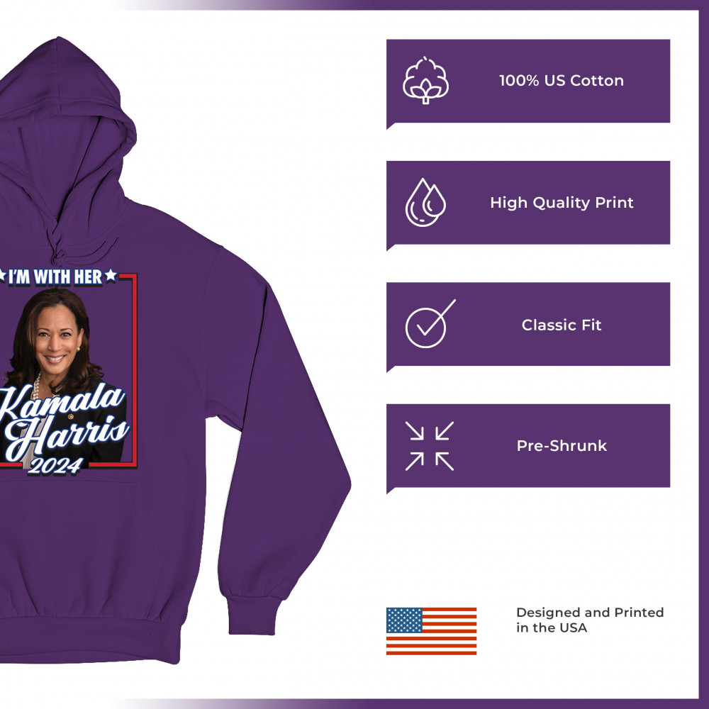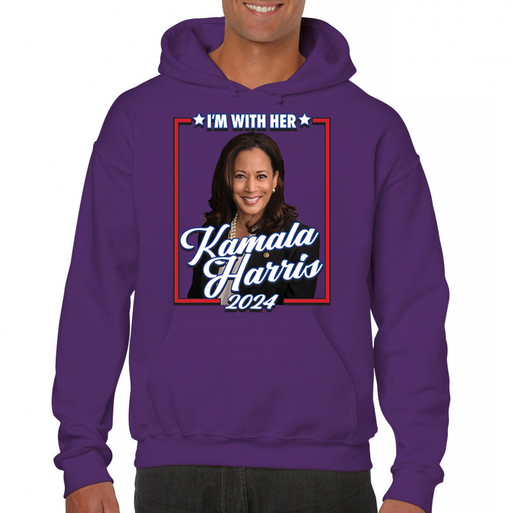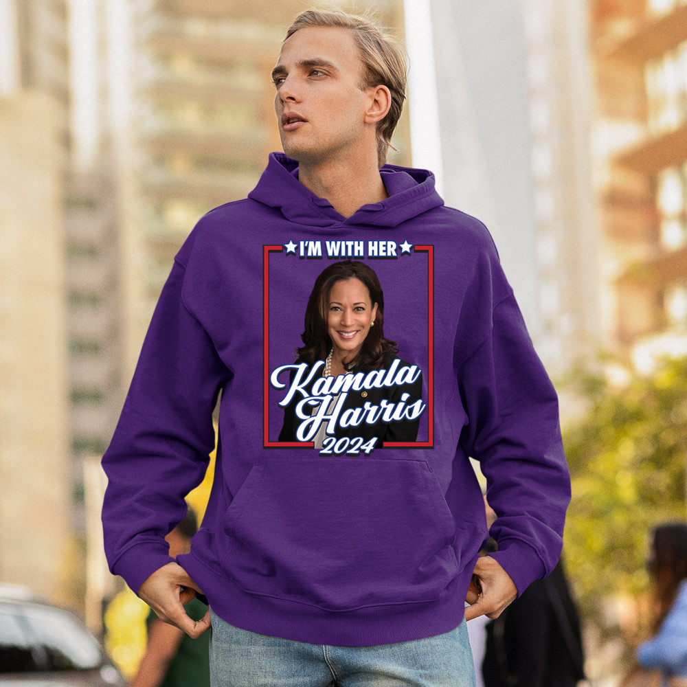 Stand with Kamala Harris in her 2024 presidential campaign with this vibrant design. Highlighting her commitment to progressive causes, this design is perfect for supporters of LGBTQ+ rights, women's rights, and social justice. Featuring the iconic "I'm With Her" slogan, it's a bold statement for anyone who believes in a brighter future. Wear it to rallies, events, or any day to show your support for Kamala Harris and her vision for America. A great addition to any supporter’s collection!