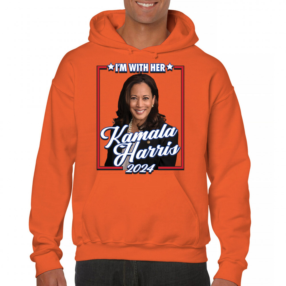 Stand with Kamala Harris in her 2024 presidential campaign with this vibrant design. Highlighting her commitment to progressive causes, this design is perfect for supporters of LGBTQ+ rights, women's rights, and social justice. Featuring the iconic "I'm With Her" slogan, it's a bold statement for anyone who believes in a brighter future. Wear it to rallies, events, or any day to show your support for Kamala Harris and her vision for America. A great addition to any supporter’s collection!