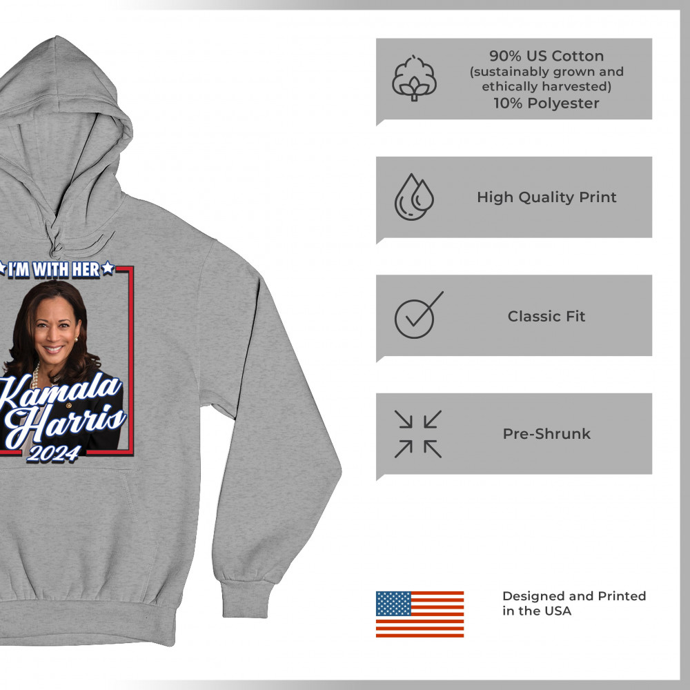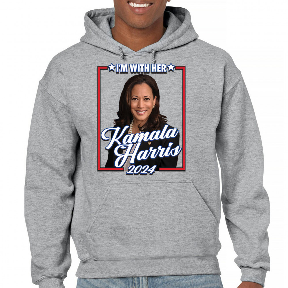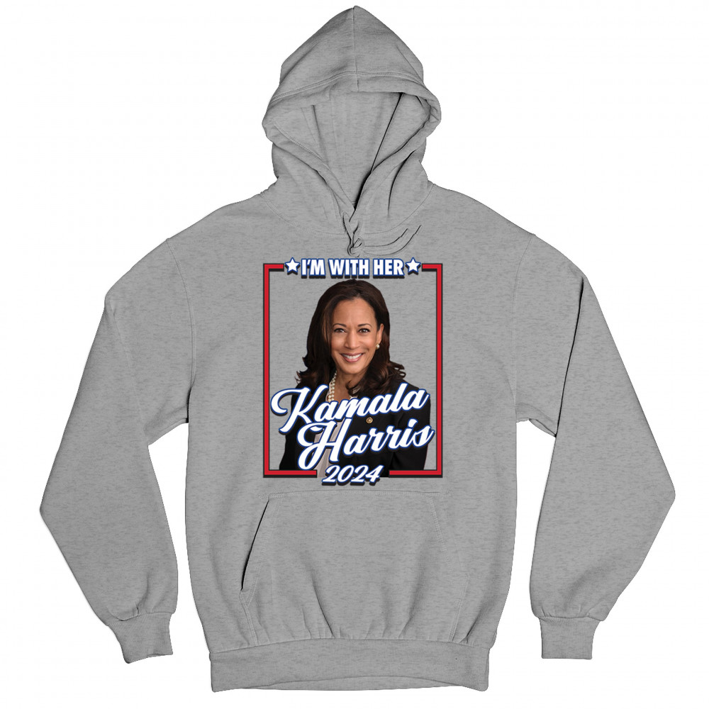 Stand with Kamala Harris in her 2024 presidential campaign with this vibrant design. Highlighting her commitment to progressive causes, this design is perfect for supporters of LGBTQ+ rights, women's rights, and social justice. Featuring the iconic "I'm With Her" slogan, it's a bold statement for anyone who believes in a brighter future. Wear it to rallies, events, or any day to show your support for Kamala Harris and her vision for America. A great addition to any supporter’s collection!