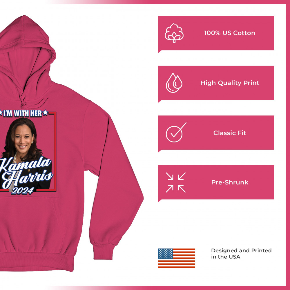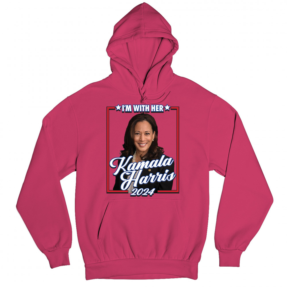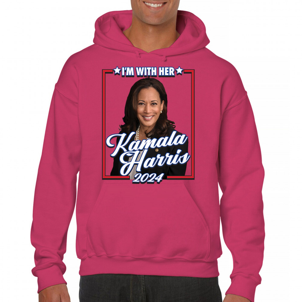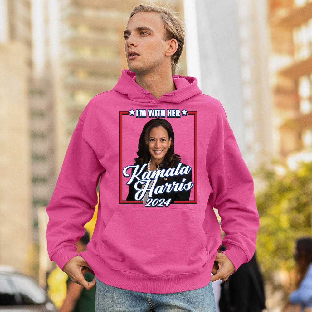 Stand with Kamala Harris in her 2024 presidential campaign with this vibrant design. Highlighting her commitment to progressive causes, this design is perfect for supporters of LGBTQ+ rights, women's rights, and social justice. Featuring the iconic "I'm With Her" slogan, it's a bold statement for anyone who believes in a brighter future. Wear it to rallies, events, or any day to show your support for Kamala Harris and her vision for America. A great addition to any supporter’s collection!