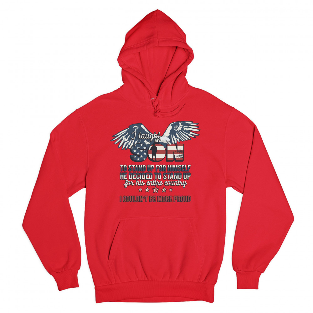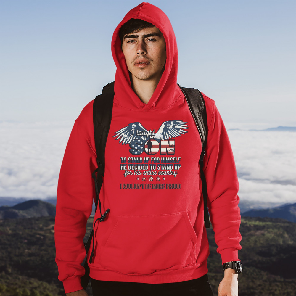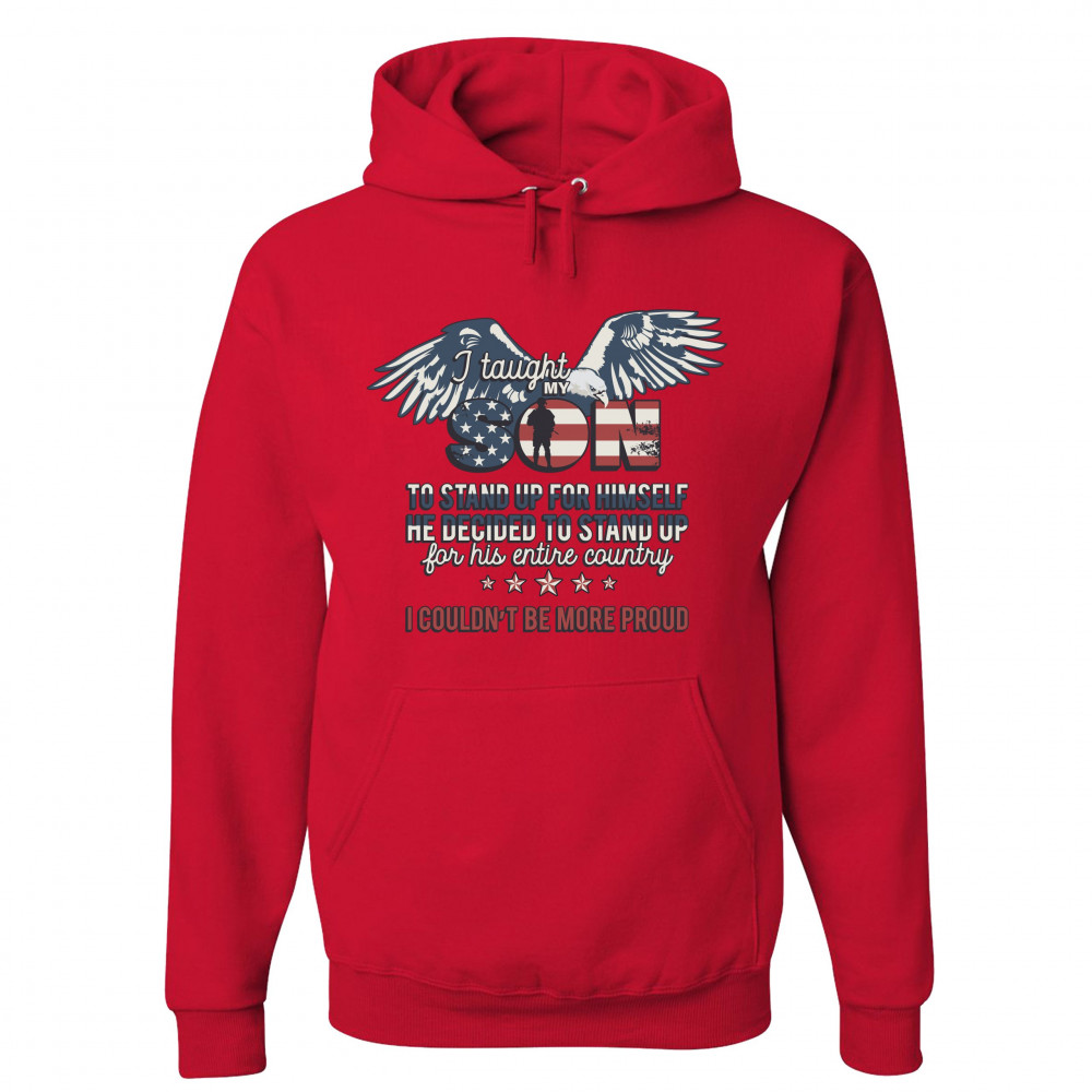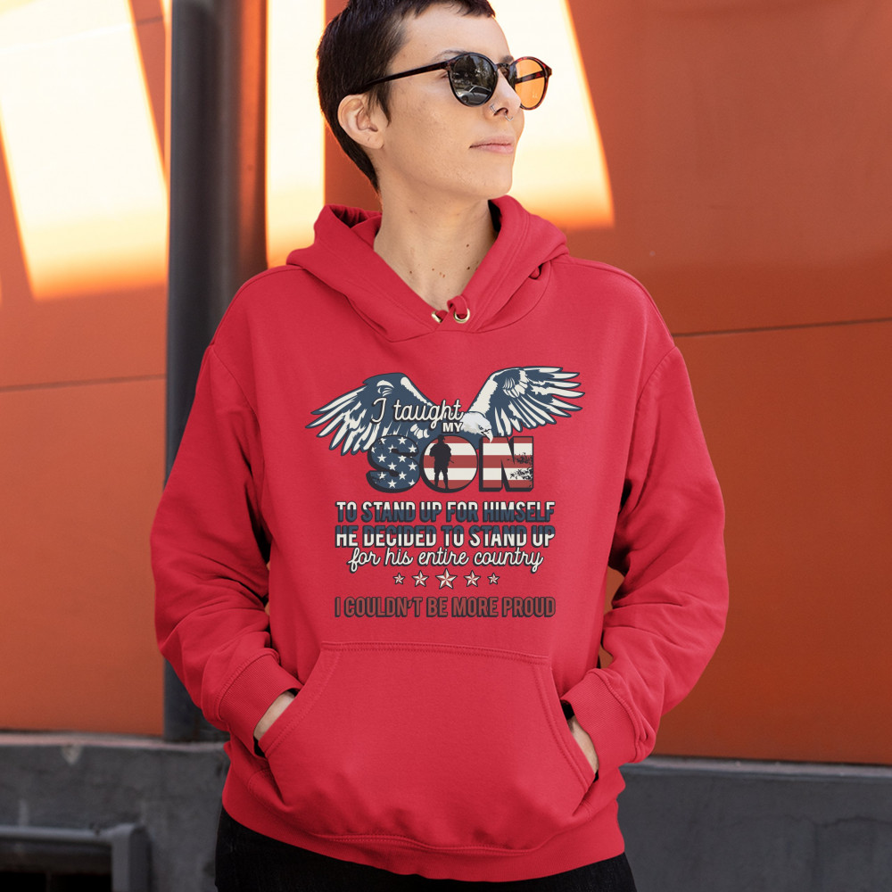 A patriotic print saying: "I Taught My Son to Stand up for Himself, He Decided to Stand Up for His Entire Country, I Couldn't Be More Proud". The print features a bald eagle, several stars and a small silhouette of a soldier inside of a letter "O" in "Son