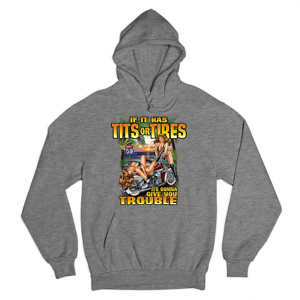 A print featuring two barely dressed sexy women leaning on a vintage motorcycle parked at the beach. There is a "Route 69" road sign in the background. The print says: "If it has tits or tires it's gonna give you trouble". A great choice for a motorcycle