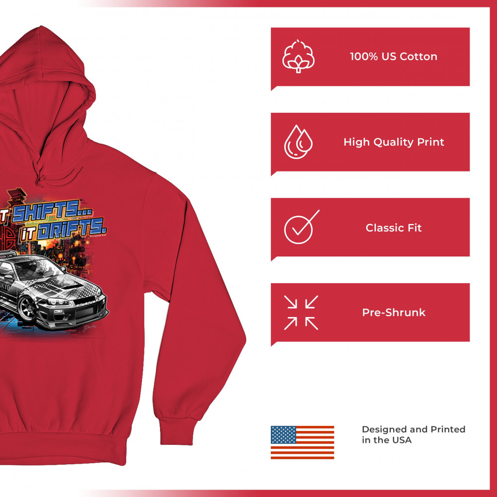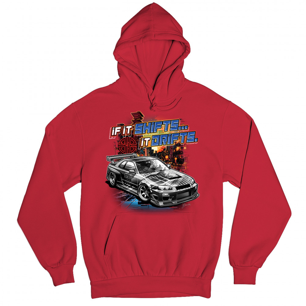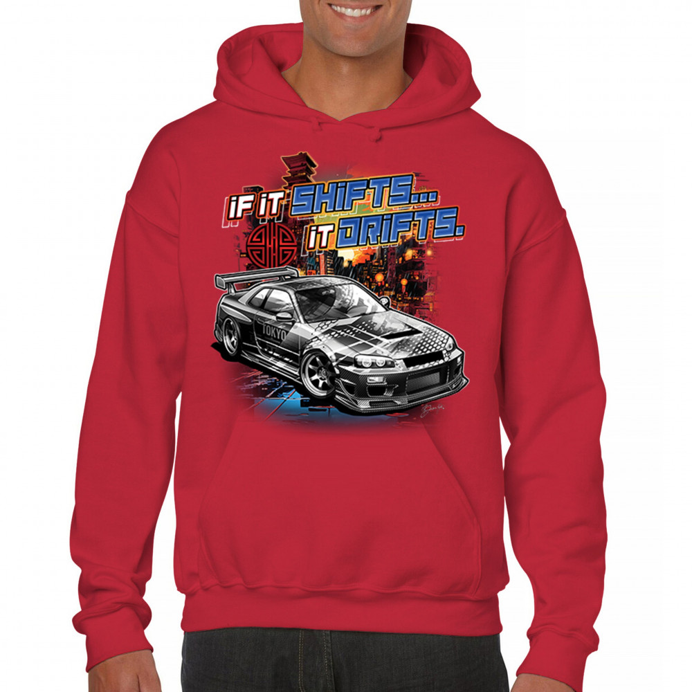 "If It Shifts, It Drifts" design. Perfect for car enthusiasts, featuring a detailed car and vibrant cityscape. Comfortable, durable, and stylish.