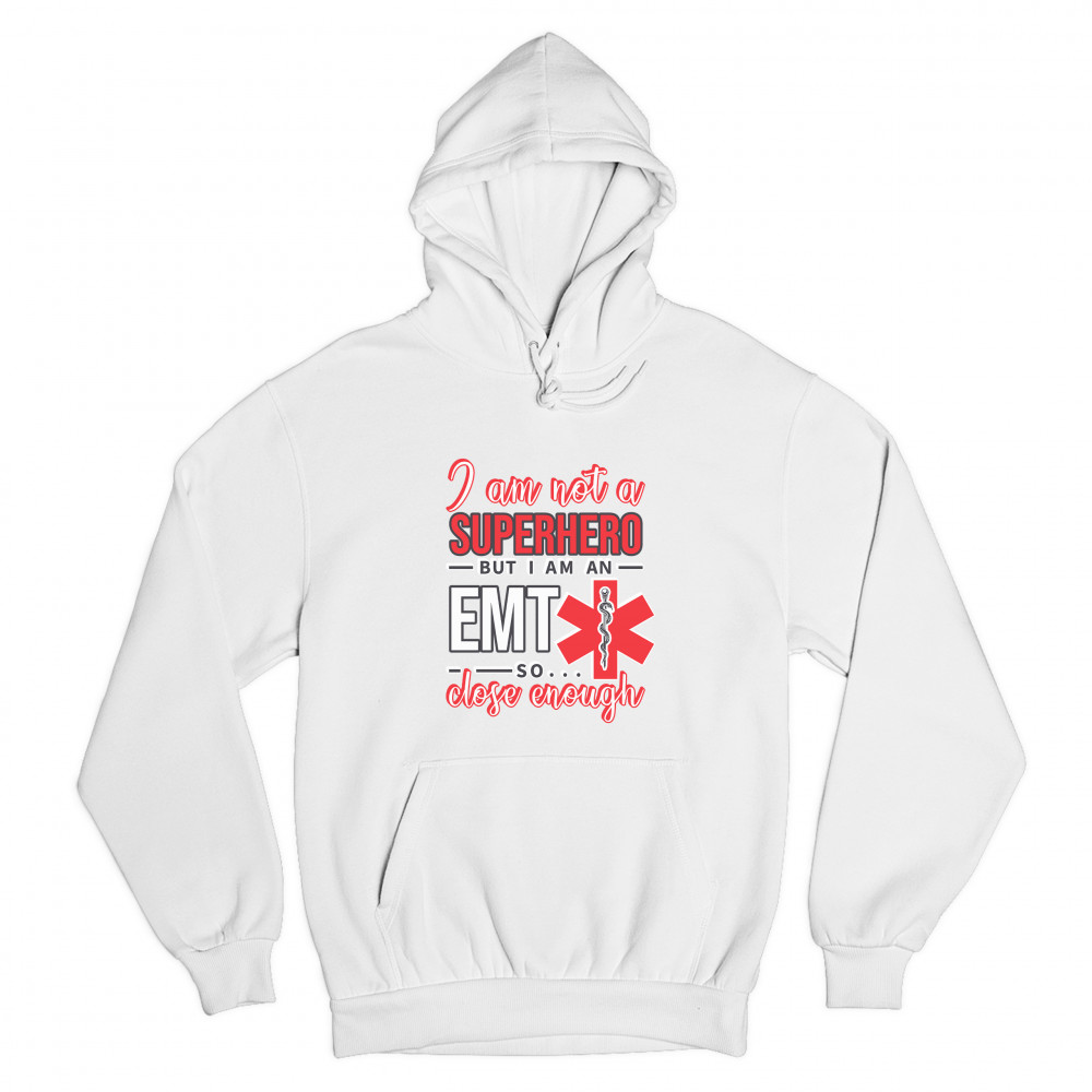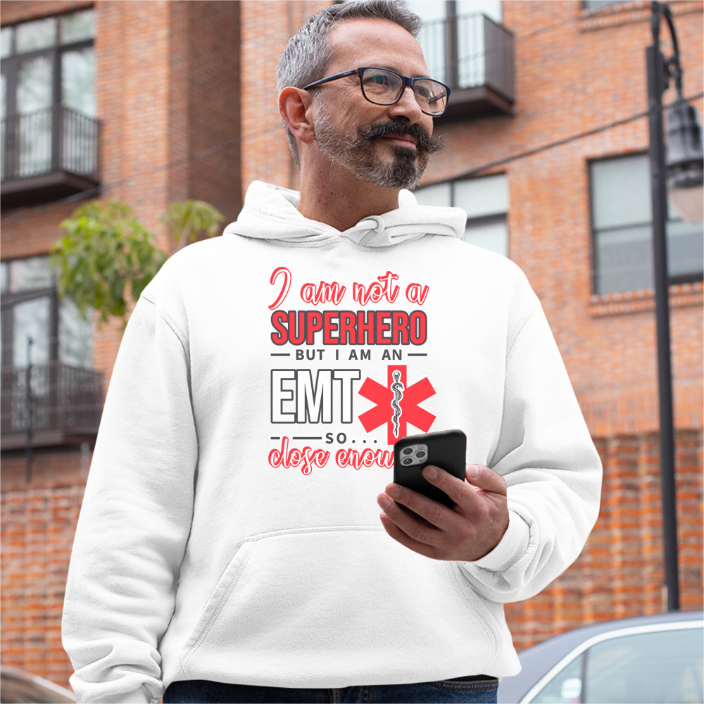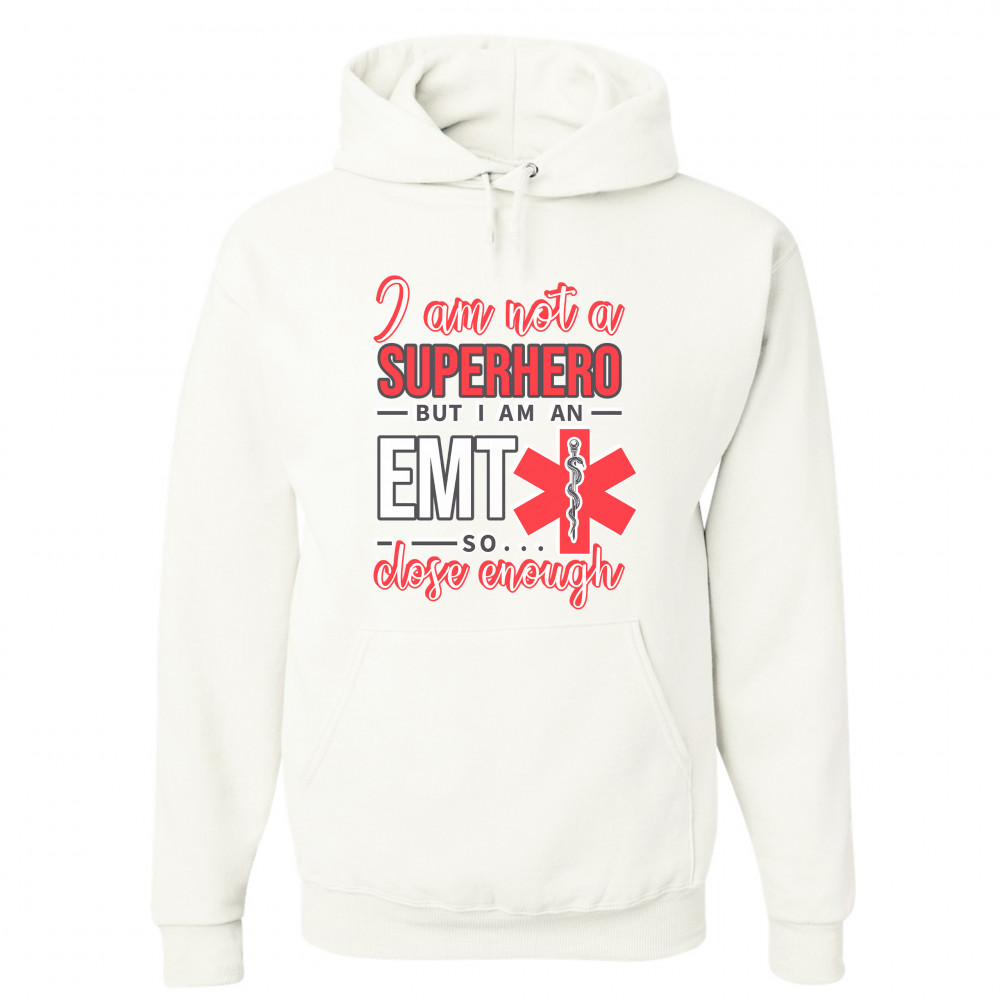A funny print saying "I'm Not a Superhero But I'm an EMT so Close Enough". All words are written in different fonts. The print also includes the Star of Life, the worldwide recognized symbol of emergency medical services, with the Rod of Asclepius inside of it. A great choice as a gift for a first responder.