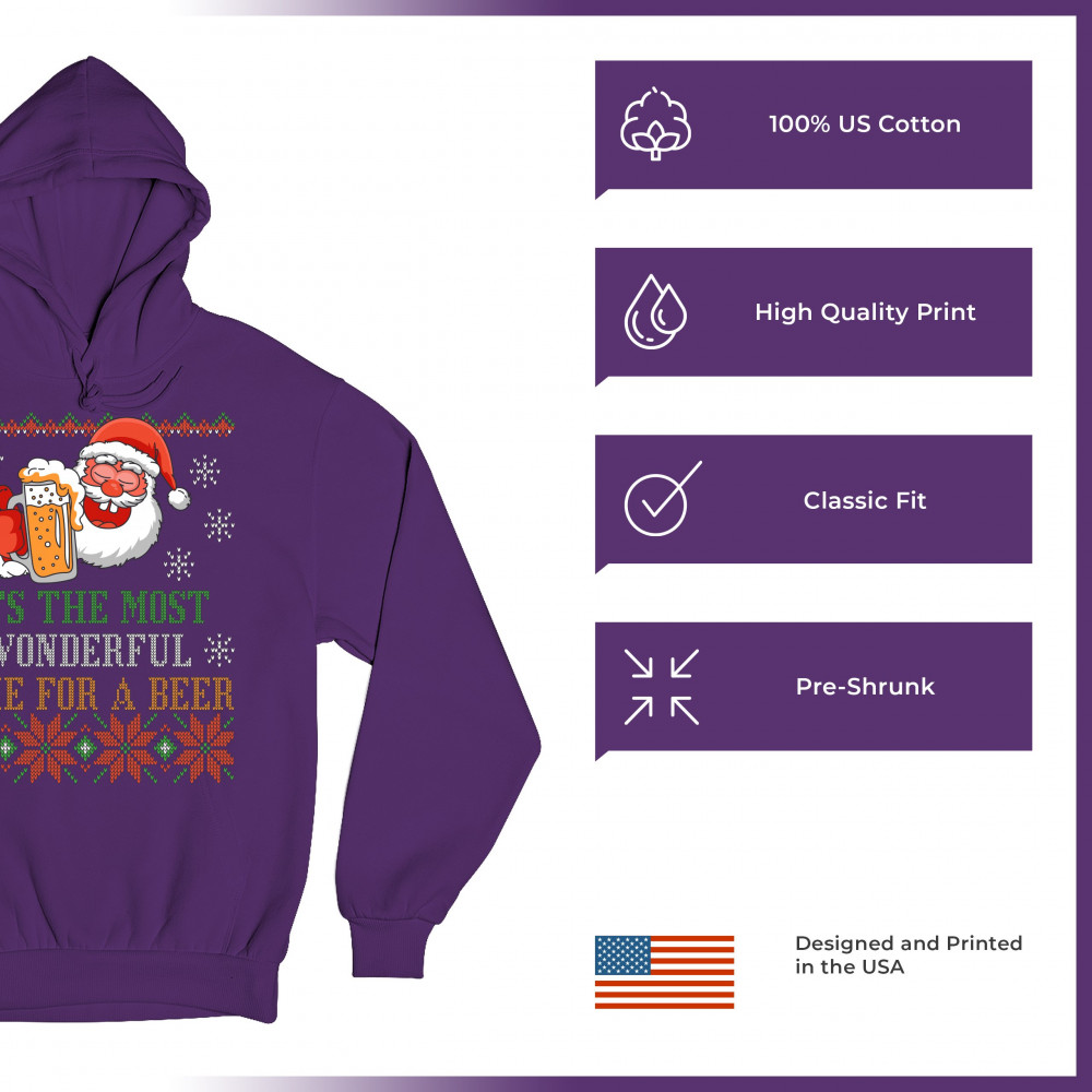 A print saying: "It's the Most Wonderful Time for a Beer" and featuring Santa Claus holding a glass of beer. The print is designed as an ugly sweater. Amazing choice for a single person who wants to make people smile and spread positive vibes on Christmas