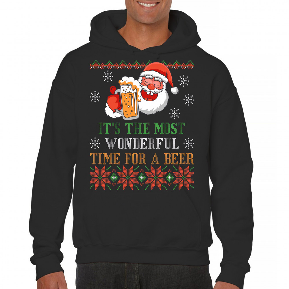 A print saying: "It's the Most Wonderful Time for a Beer" and featuring Santa Claus holding a glass of beer. The print is designed as an ugly sweater. Amazing choice for a single person who wants to make people smile and spread positive vibes on Christmas