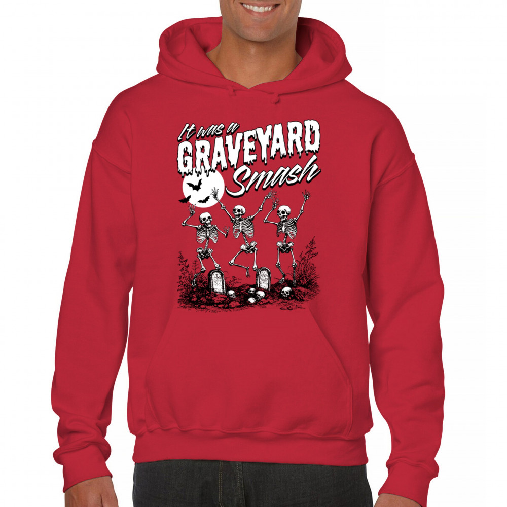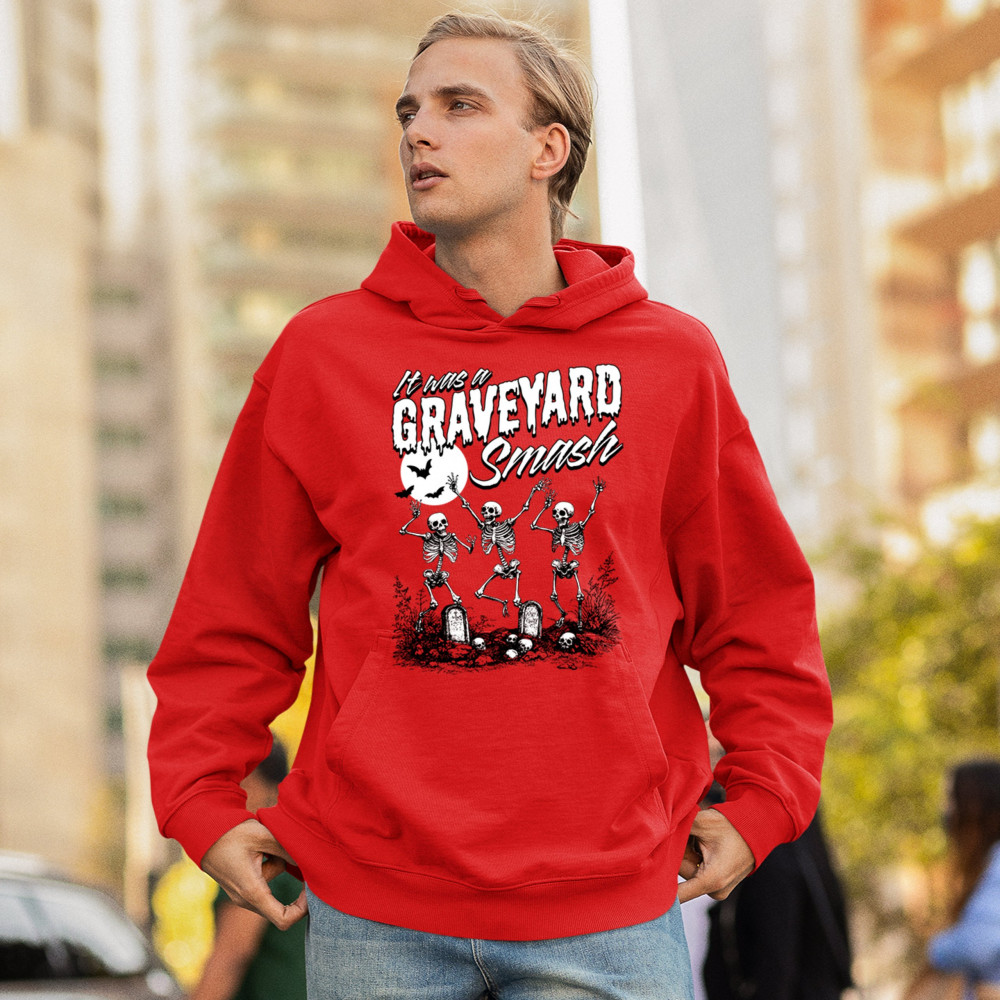 Celebrate Halloween with a fun "Graveyard Smash" design featuring dancing skeletons. Perfect for parties and haunted house events!