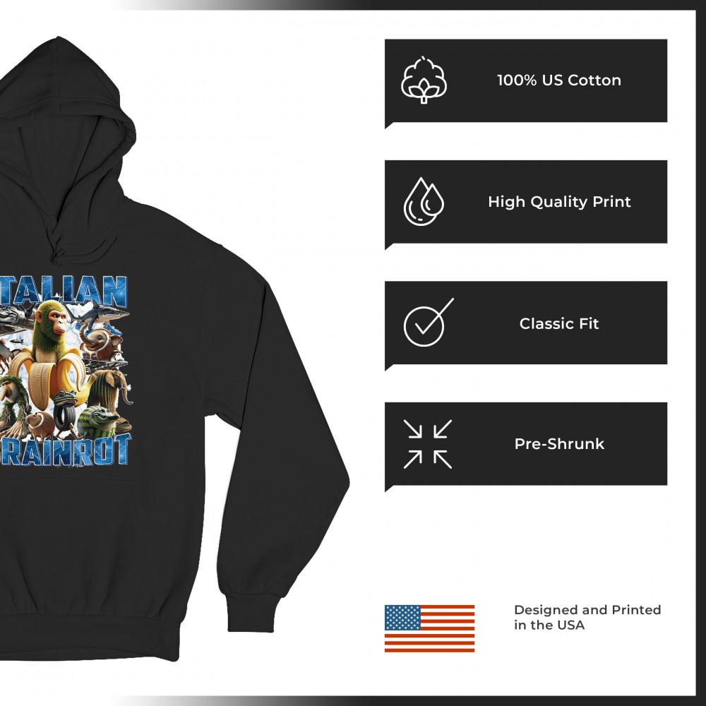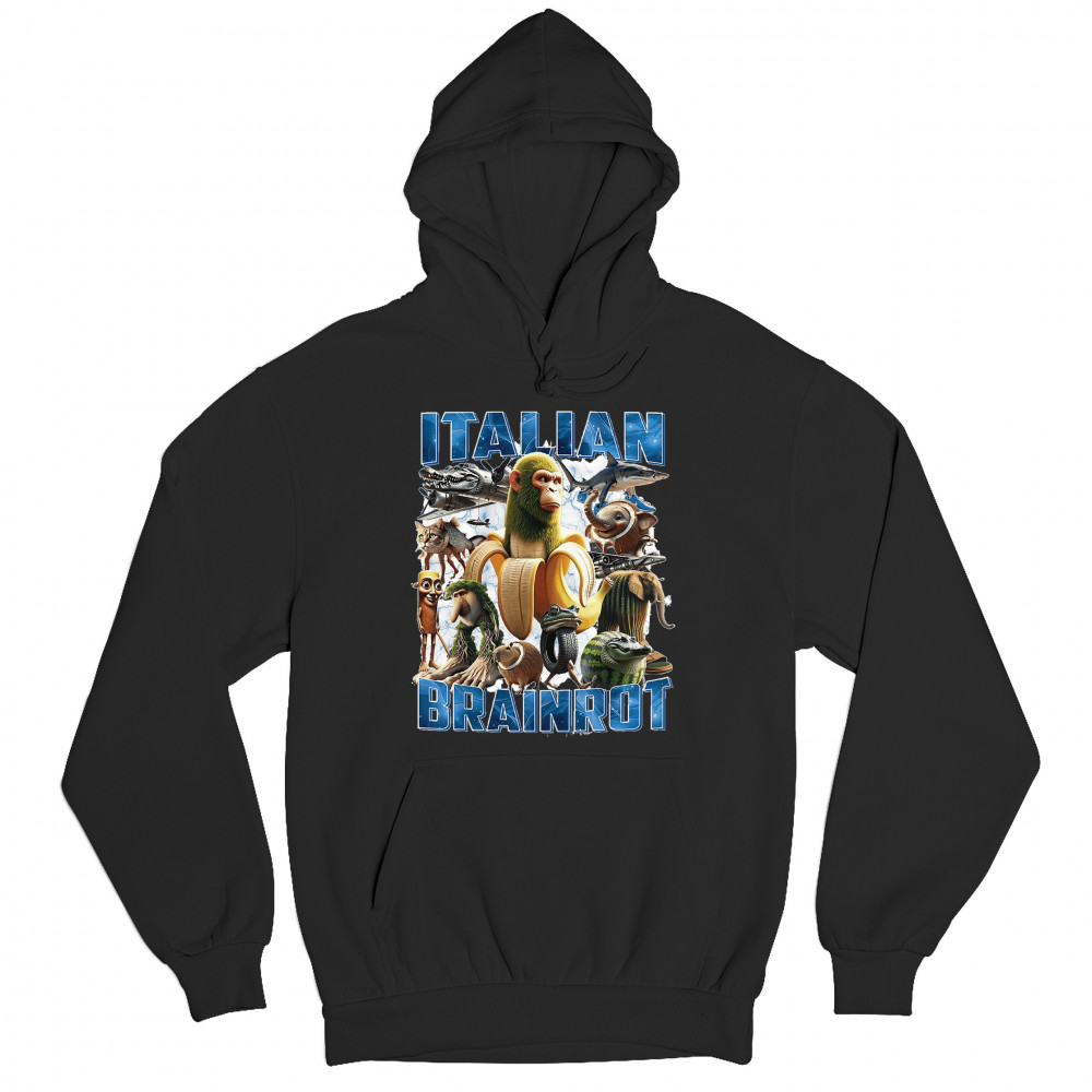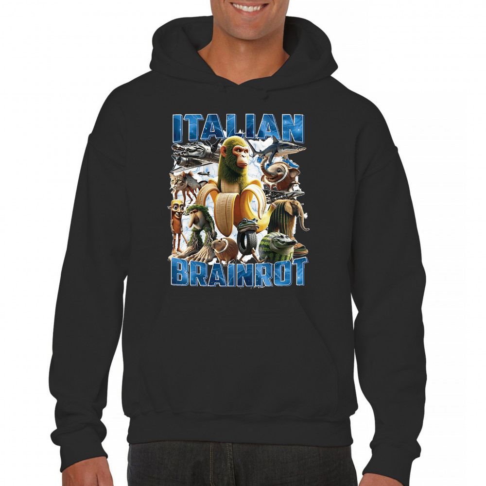 This design captures the full force of Italian brainrot—bananas, sharks, monkeys, and meme beasts collide in an unfiltered internet-core explosion. Perfect for fans of cursed humor, Gen Z trends, absurd fashion, TikTok memes, ironic style, surreal pop art, chaotic culture, digital nonsense, Gen Alpha brainrot, and hyper-online energy.