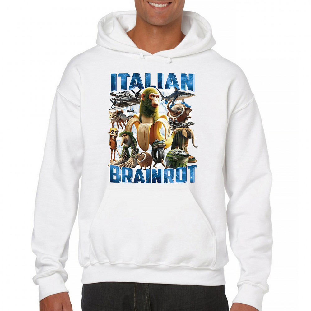 This design captures the full force of Italian brainrot—bananas, sharks, monkeys, and meme beasts collide in an unfiltered internet-core explosion. Perfect for fans of cursed humor, Gen Z trends, absurd fashion, TikTok memes, ironic style, surreal pop art, chaotic culture, digital nonsense, Gen Alpha brainrot, and hyper-online energy.