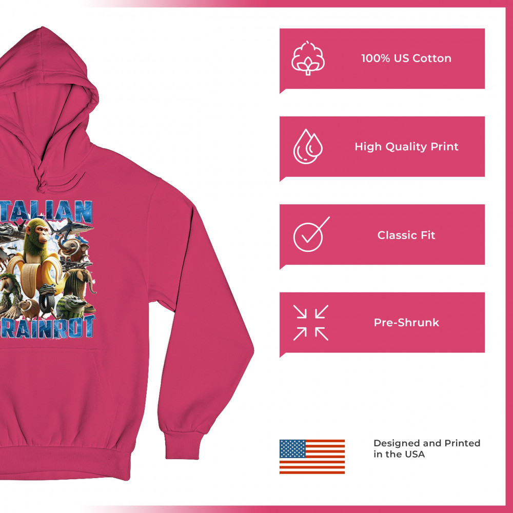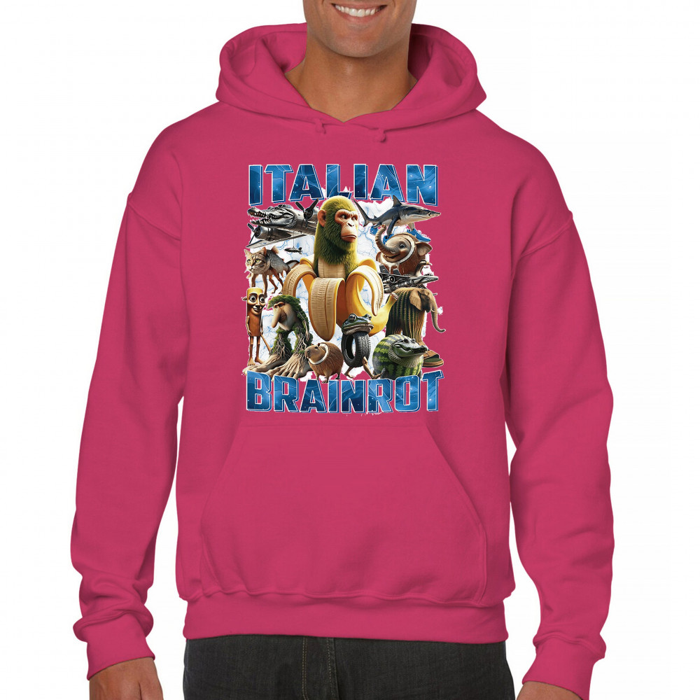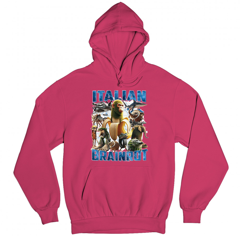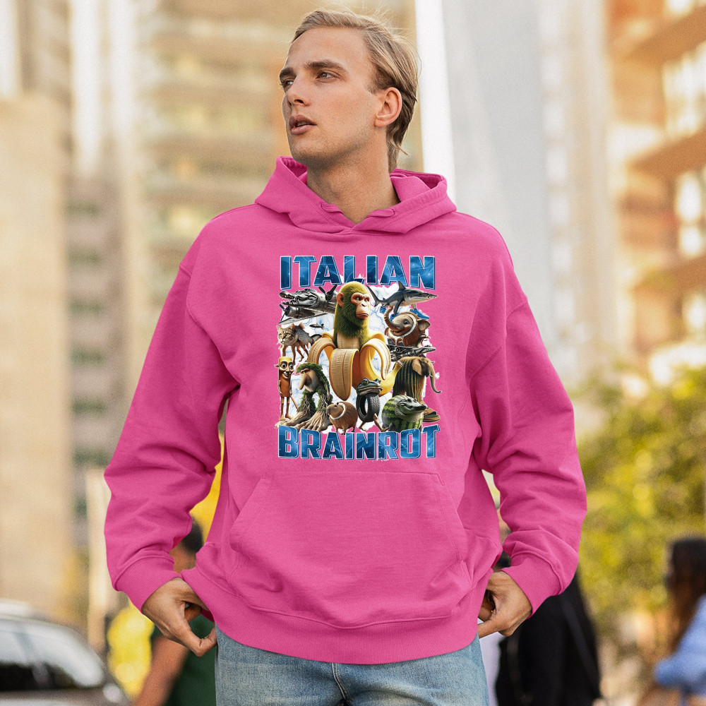 This design captures the full force of Italian brainrot—bananas, sharks, monkeys, and meme beasts collide in an unfiltered internet-core explosion. Perfect for fans of cursed humor, Gen Z trends, absurd fashion, TikTok memes, ironic style, surreal pop art, chaotic culture, digital nonsense, Gen Alpha brainrot, and hyper-online energy.