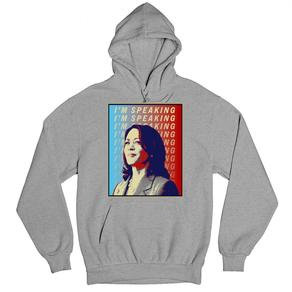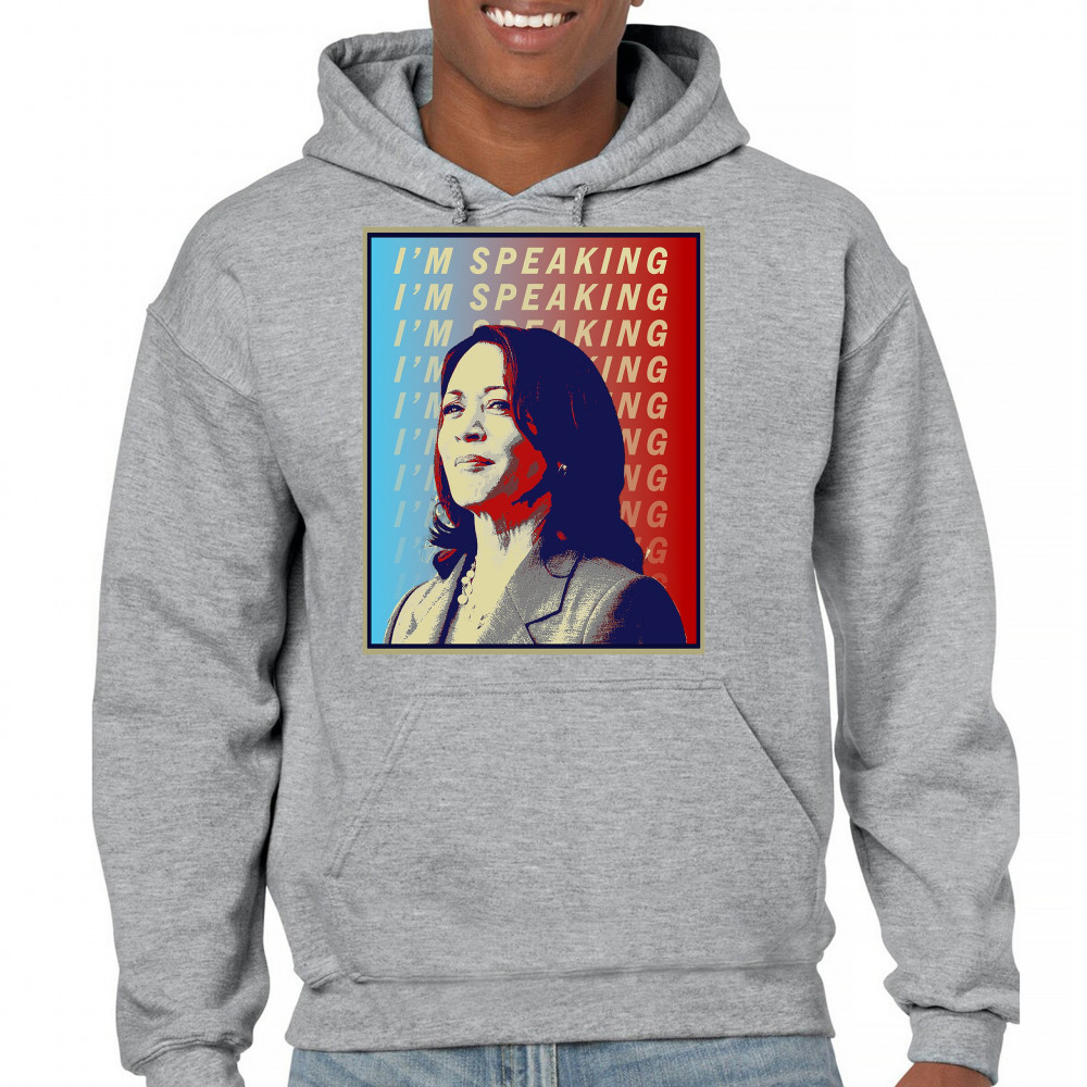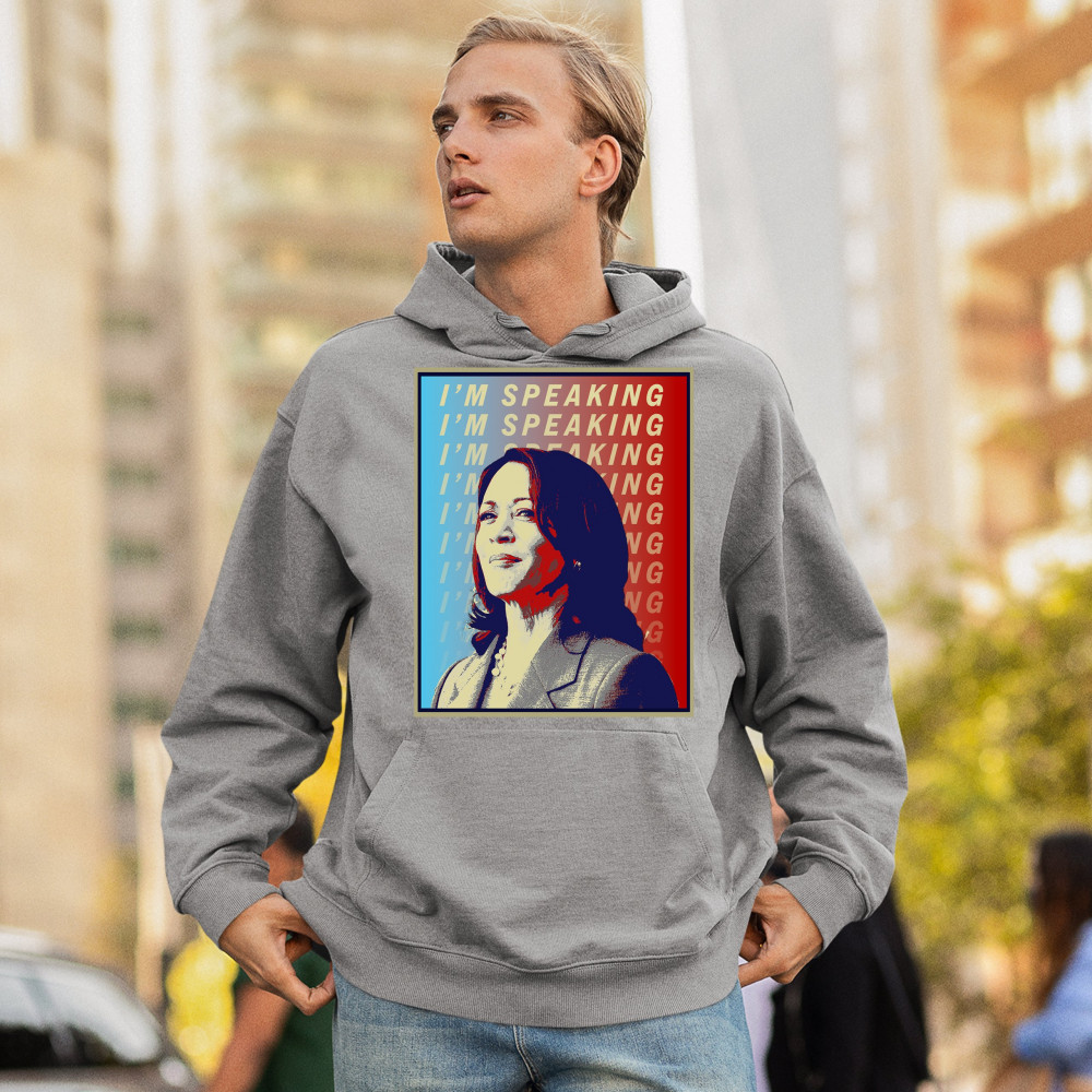 Support Kamala Harris with this bold and inspiring design. "I'M SPEAKING" echoes her powerful voice in the political arena, making it perfect for anti-Trump supporters, liberals, and Democrats. Crafted from durable materials, this design is comfortable for any event, from rallies to casual outings. Celebrate diversity and the historic candidacy of the potential first female president, resonating with black Americans, Hispanic Americans, LGBTQ supporters, and other minorities. Make a statement of hope and progress with this unique design.