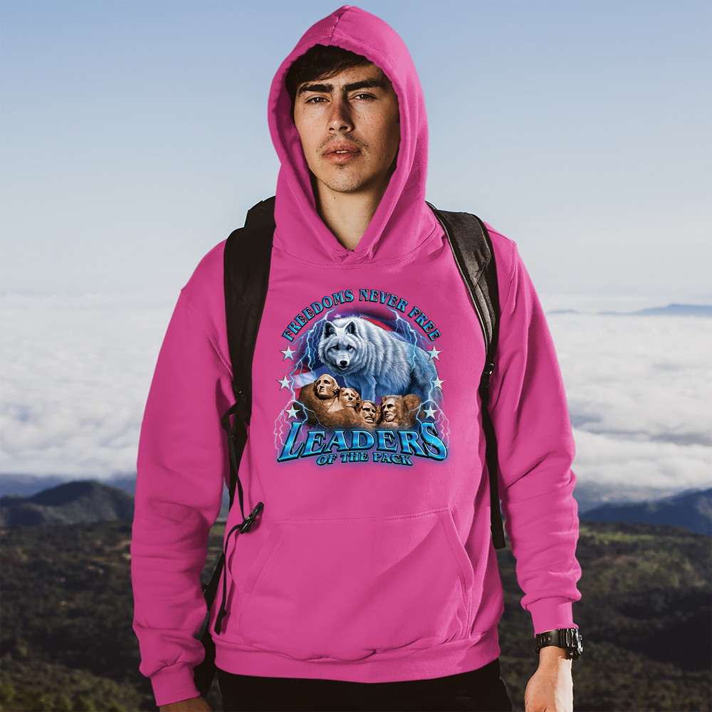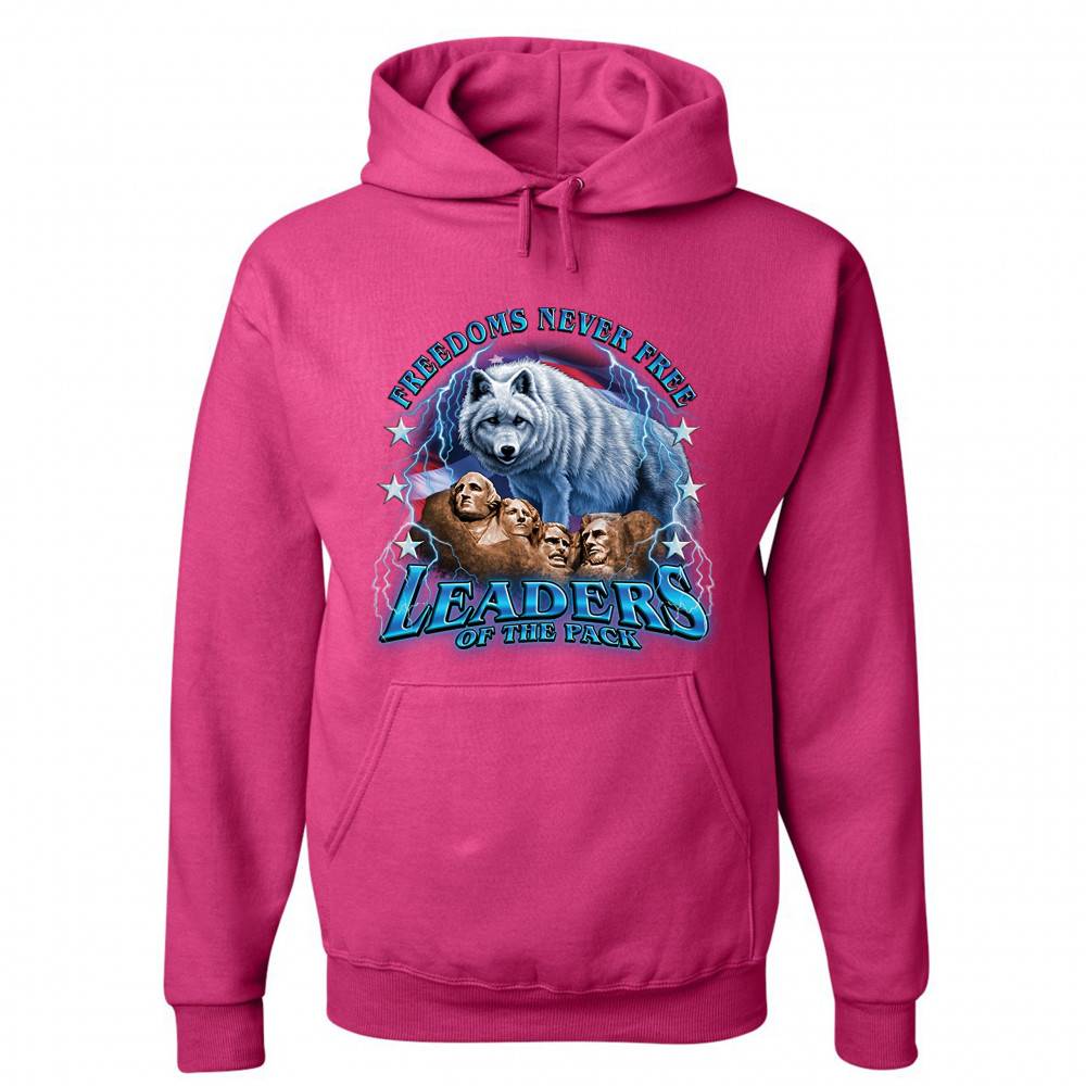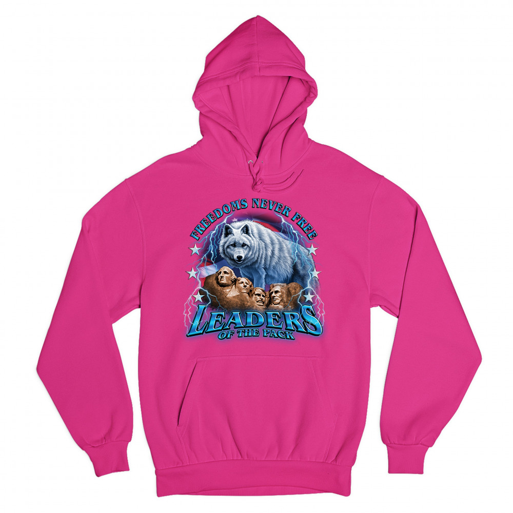 A patriotic print featuring the Mount Rushmore. There is a huge white wolf with the American flag in the background and lightning strikes all over the place. The print says: "Freedom's Never Free, Leaders of the Pack". Great choice to wear on Independence