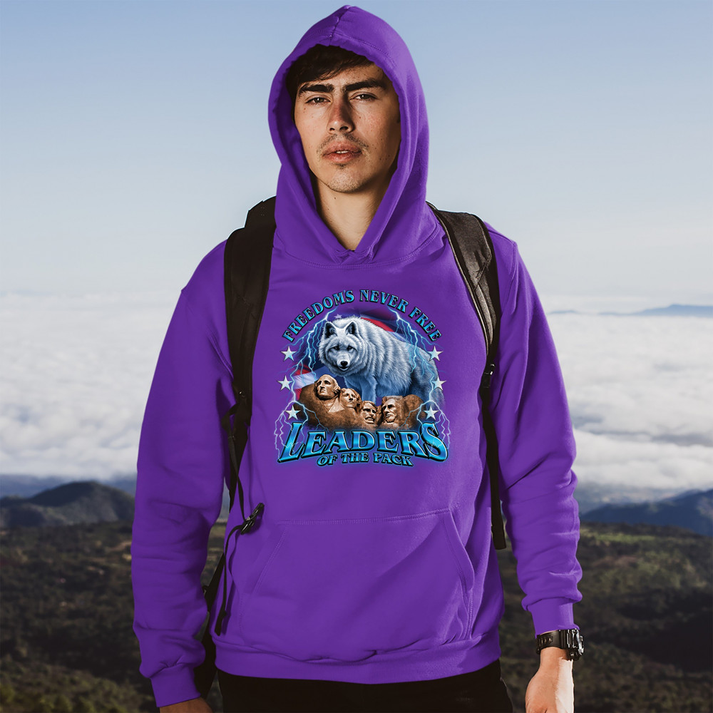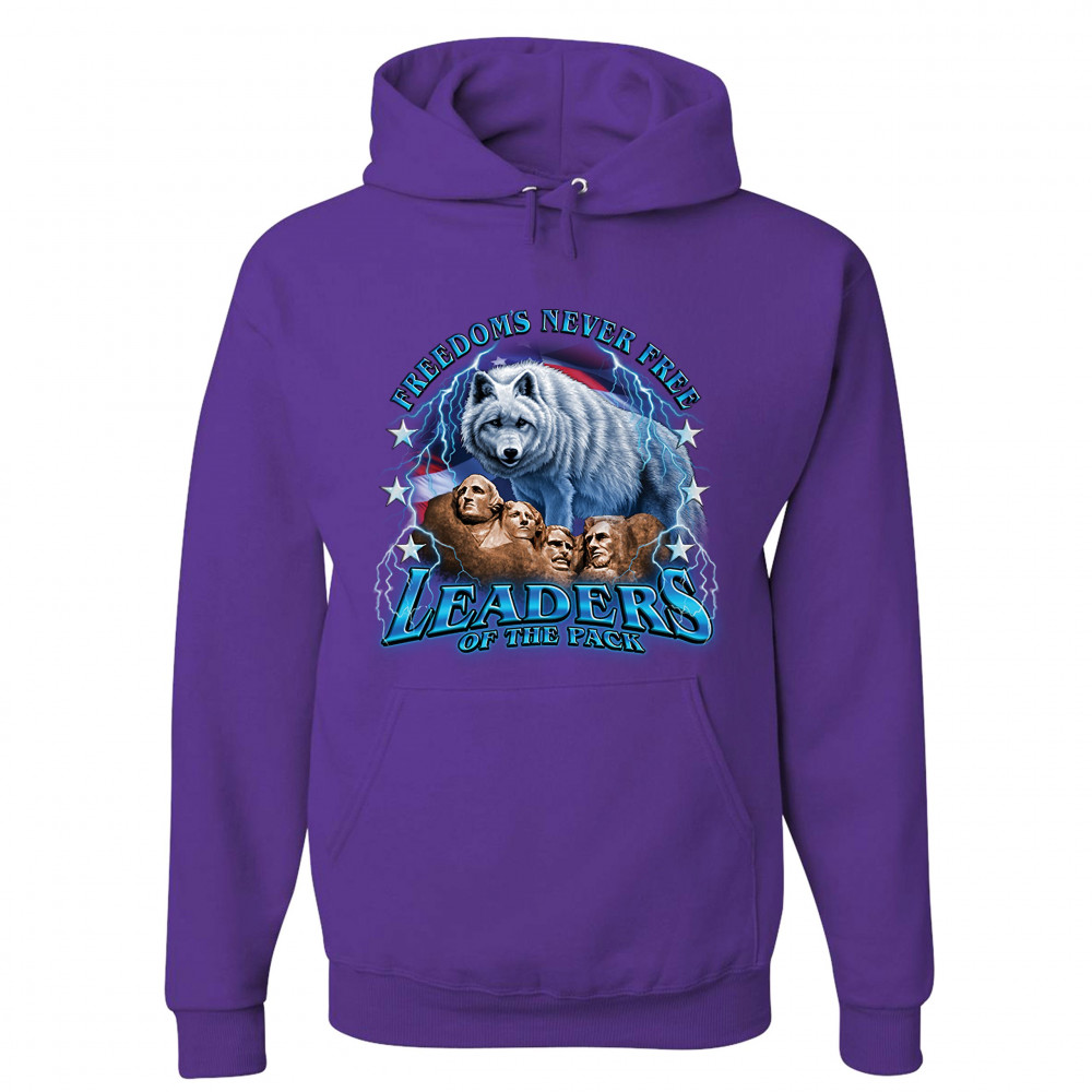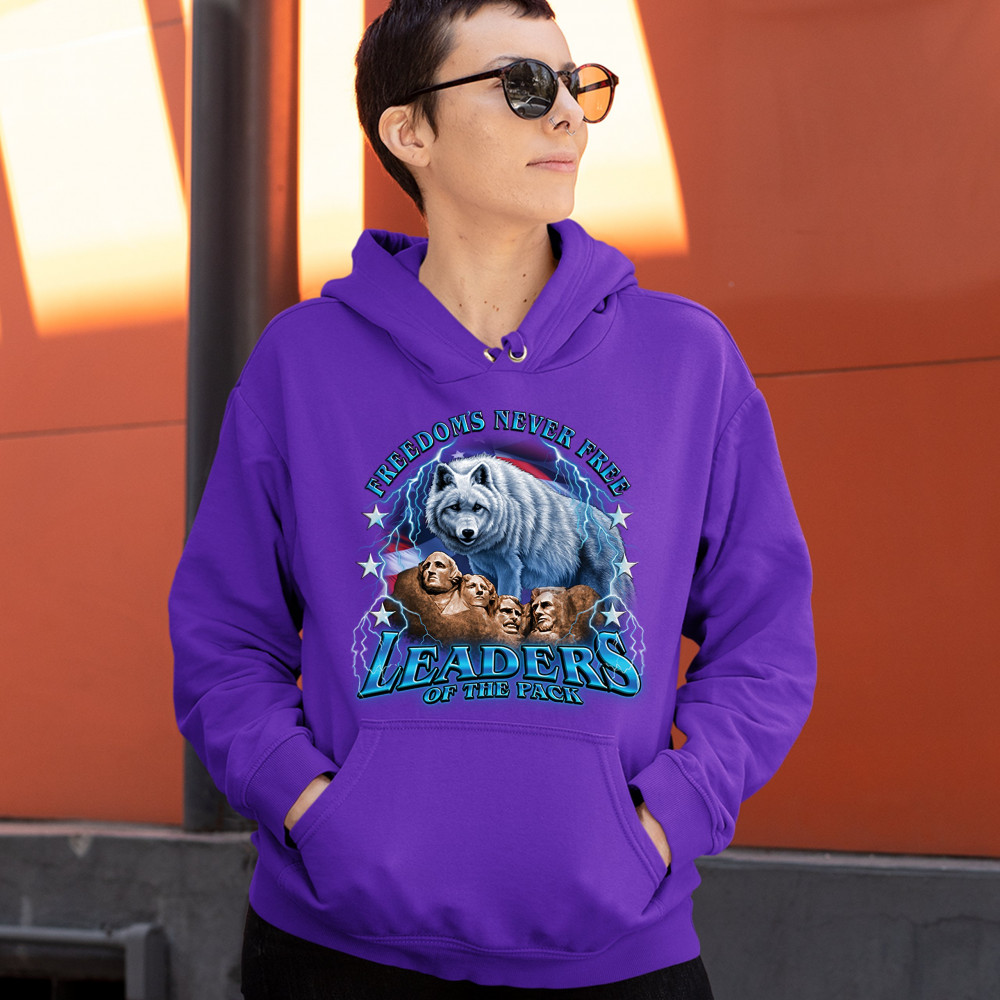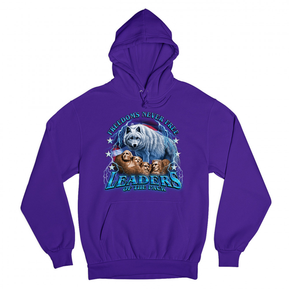 A patriotic print featuring the Mount Rushmore. There is a huge white wolf with the American flag in the background and lightning strikes all over the place. The print says: "Freedom's Never Free, Leaders of the Pack". Great choice to wear on Independence