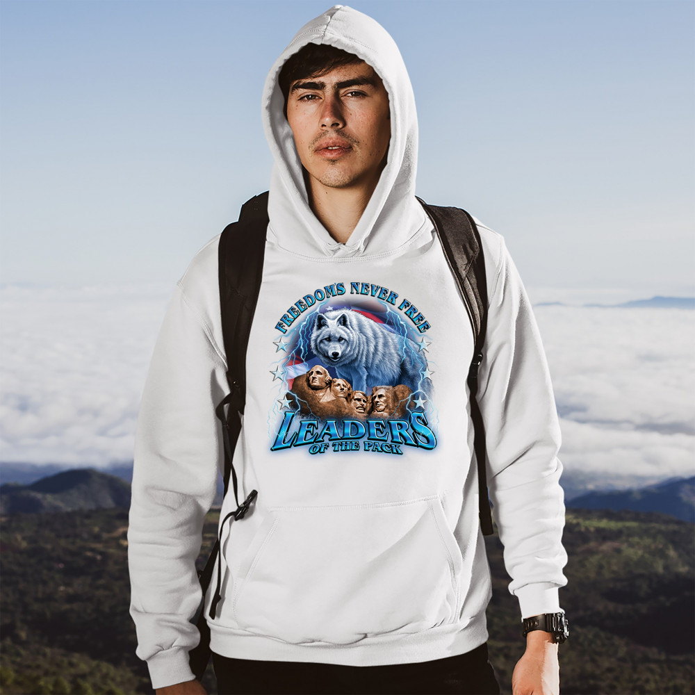 A patriotic print featuring the Mount Rushmore. There is a huge white wolf with the American flag in the background and lightning strikes all over the place. The print says: "Freedom's Never Free, Leaders of the Pack". Great choice to wear on Independence