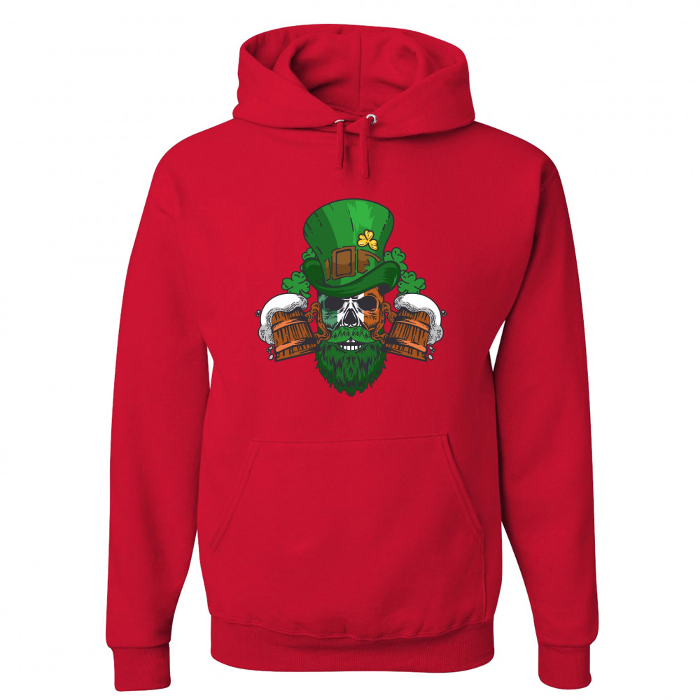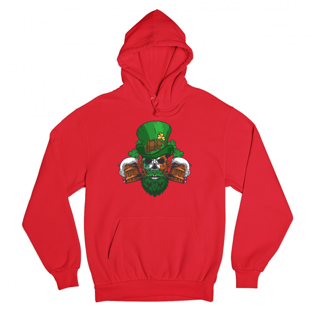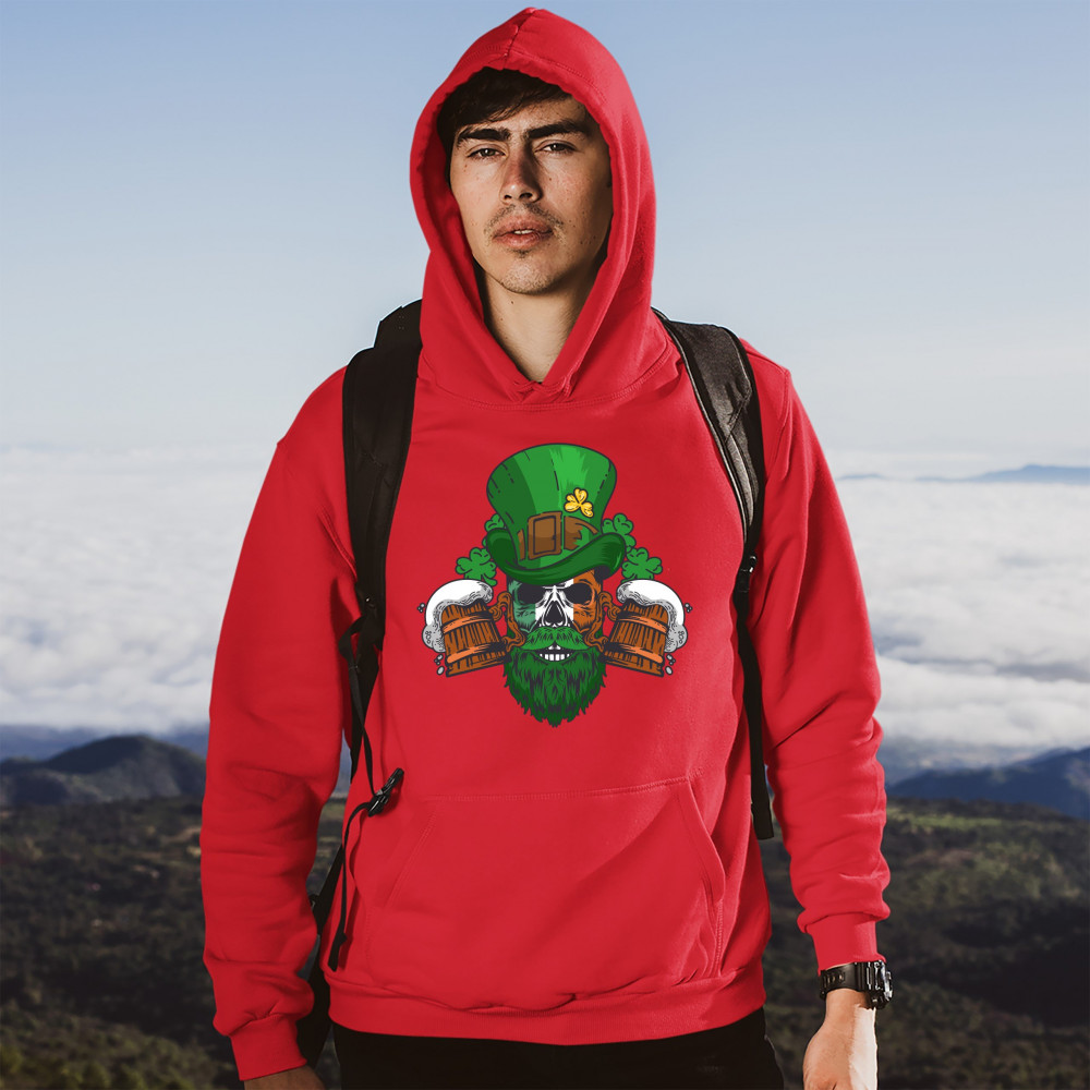 A print featuring a skull with green beard and Irish flag face. The skull is wearing a leprechaun hat. There are two beer mugs and numerous shamrocks around the skull. A great choice to wear on March 17 to celebrate the St. Patrick's Day and showcase your
