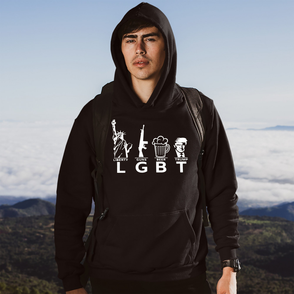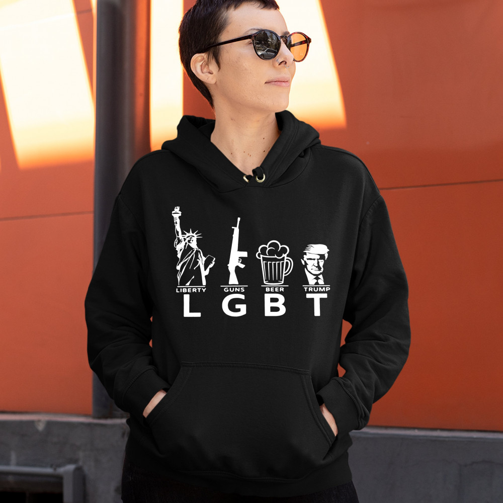 A funny political print featuring big letters LGBT, which stand for "Liberty, Guns, Beer and Trump". Above each word there are an underlined images of the Statue of Liberty, a rifle, a glass of beer and a picture of Donald Trump respectively. A great choi