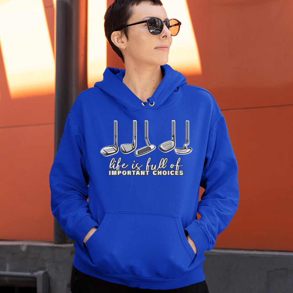 LIFE IS FULL OF IMPORTANT CHOICES sweatshirt funny golf clubs golfing hoodie royal blue