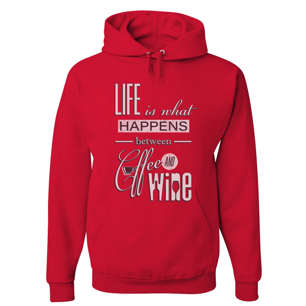 A print saying "Life is what happens between coffee and wine". Inside the letter "C" in "coffee" there is a cup and inside the word "wine" there are silhouettes of a bottle and a glass. Wear it to spread positive vibes and show your passion for the two best drinks in the universe!