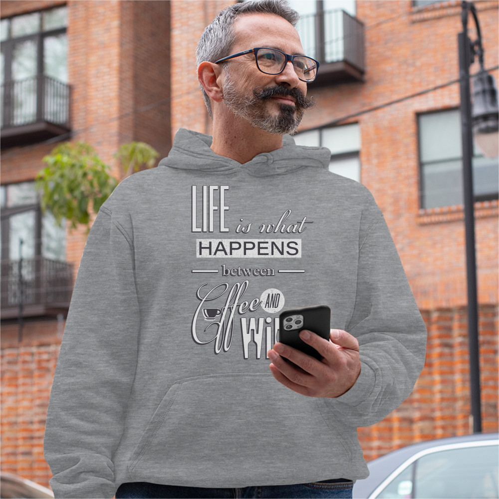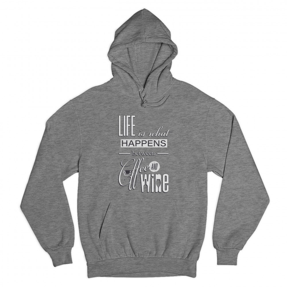 A print saying "Life is what happens between coffee and wine". Inside the letter "C" in "coffee" there is a cup and inside the word "wine" there are silhouettes of a bottle and a glass. Wear it to spread positive vibes and show your passion for the two best drinks in the universe!