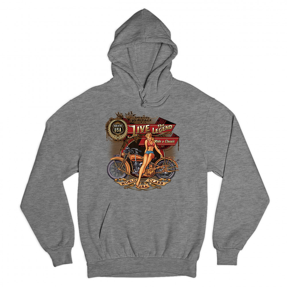 A print featuring a vintage motorcycle with a sexy girl sitting on top of it. On multiple stripes or signs the print says: "American Heritage, Made in the USA, Live the Legend, Ride a Classic, Live to Ride, World Class U.S.A." A great choice for a motorcy