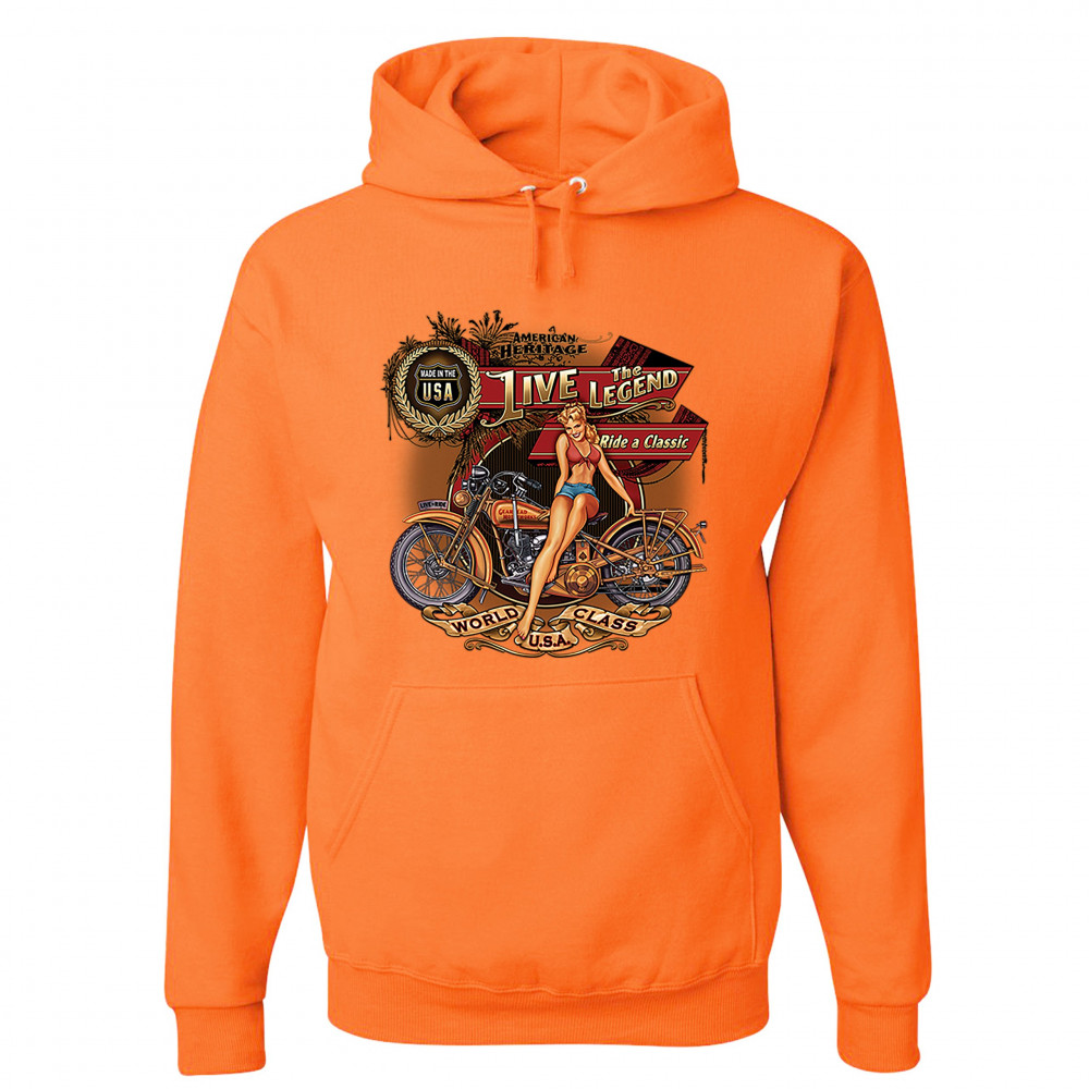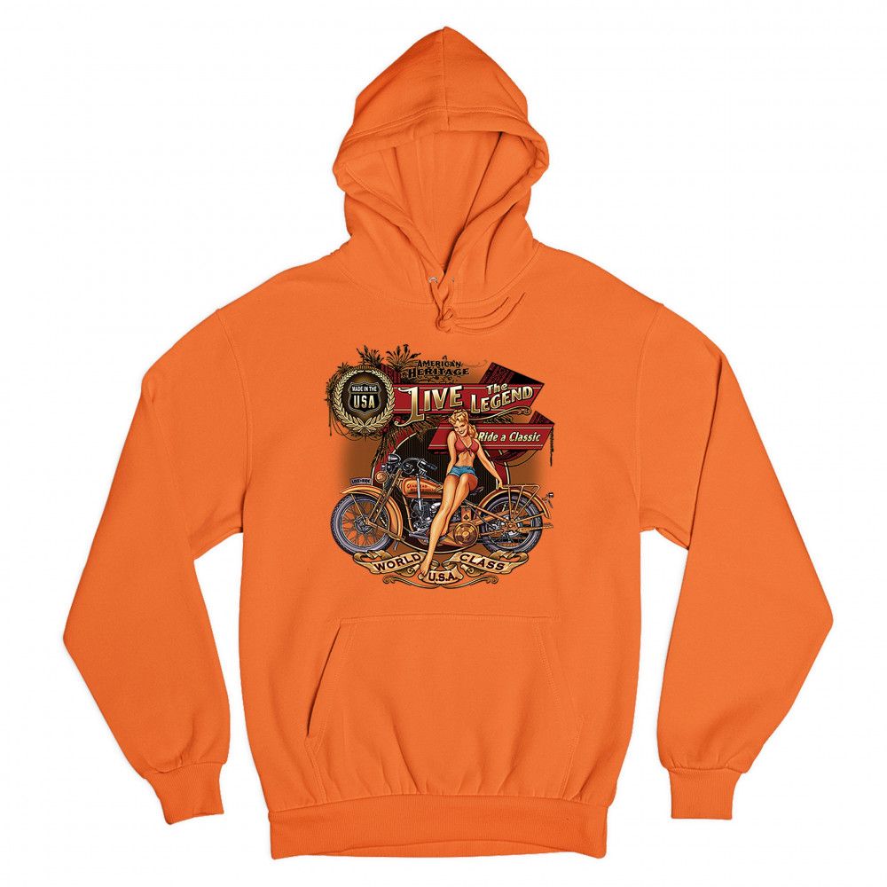 A print featuring a vintage motorcycle with a sexy girl sitting on top of it. On multiple stripes or signs the print says: "American Heritage, Made in the USA, Live the Legend, Ride a Classic, Live to Ride, World Class U.S.A." A great choice for a motorcy