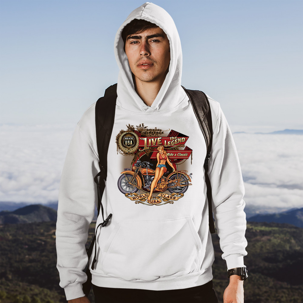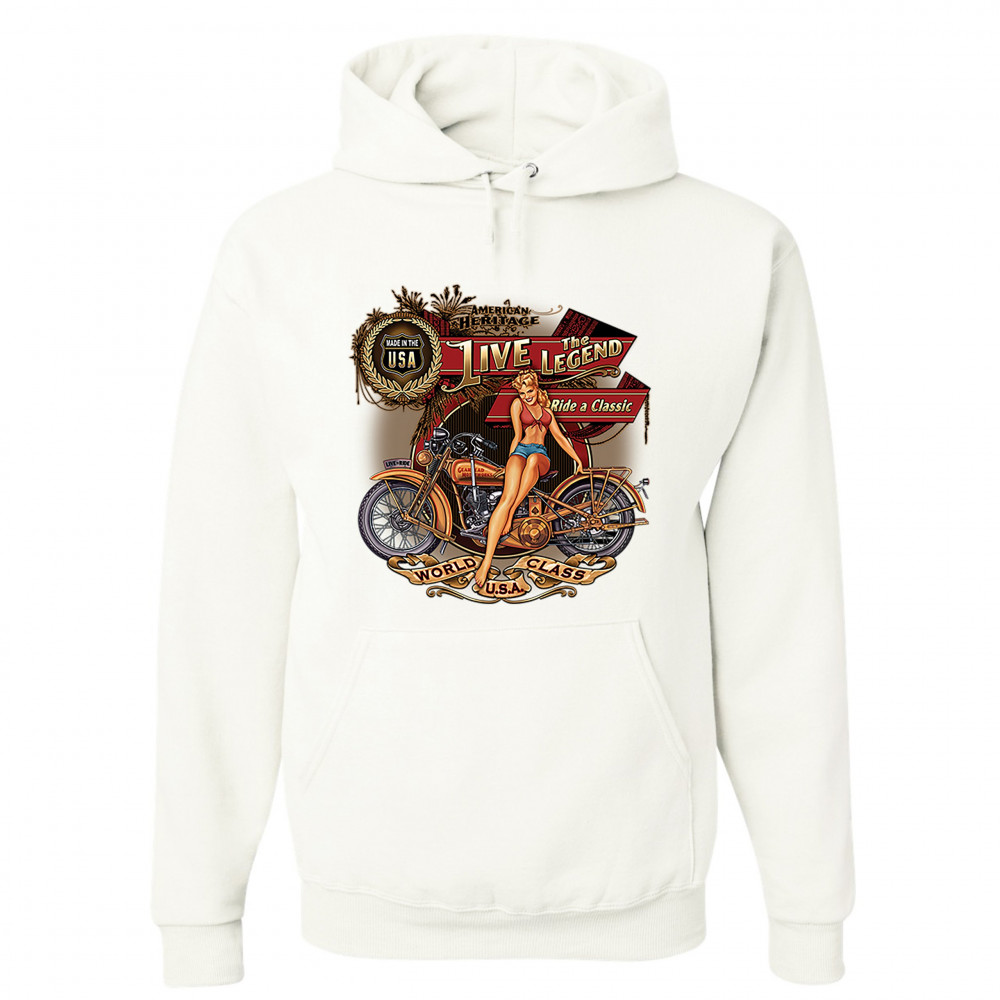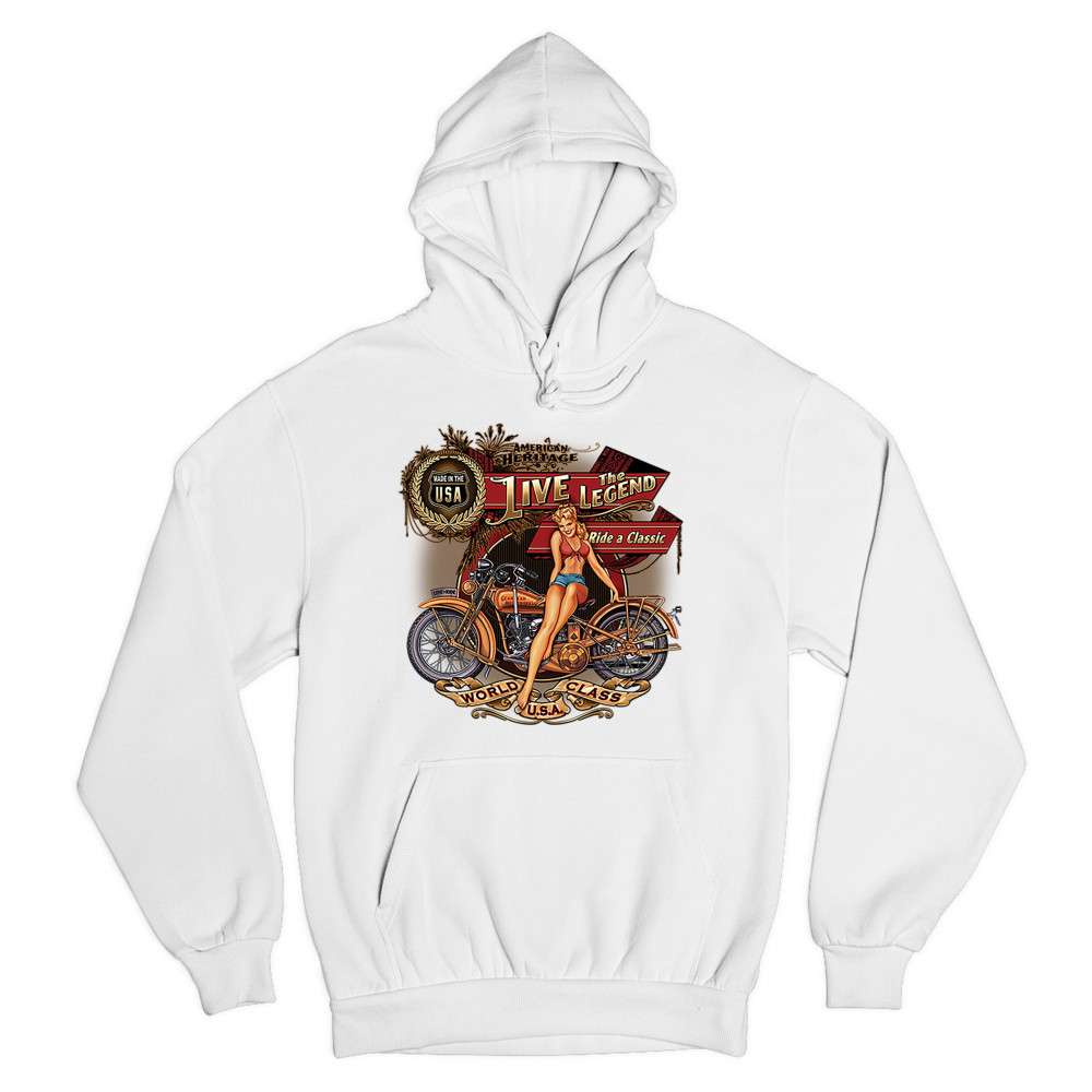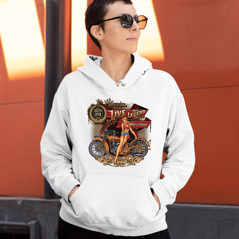 A print featuring a vintage motorcycle with a sexy girl sitting on top of it. On multiple stripes or signs the print says: "American Heritage, Made in the USA, Live the Legend, Ride a Classic, Live to Ride, World Class U.S.A." A great choice for a motorcy