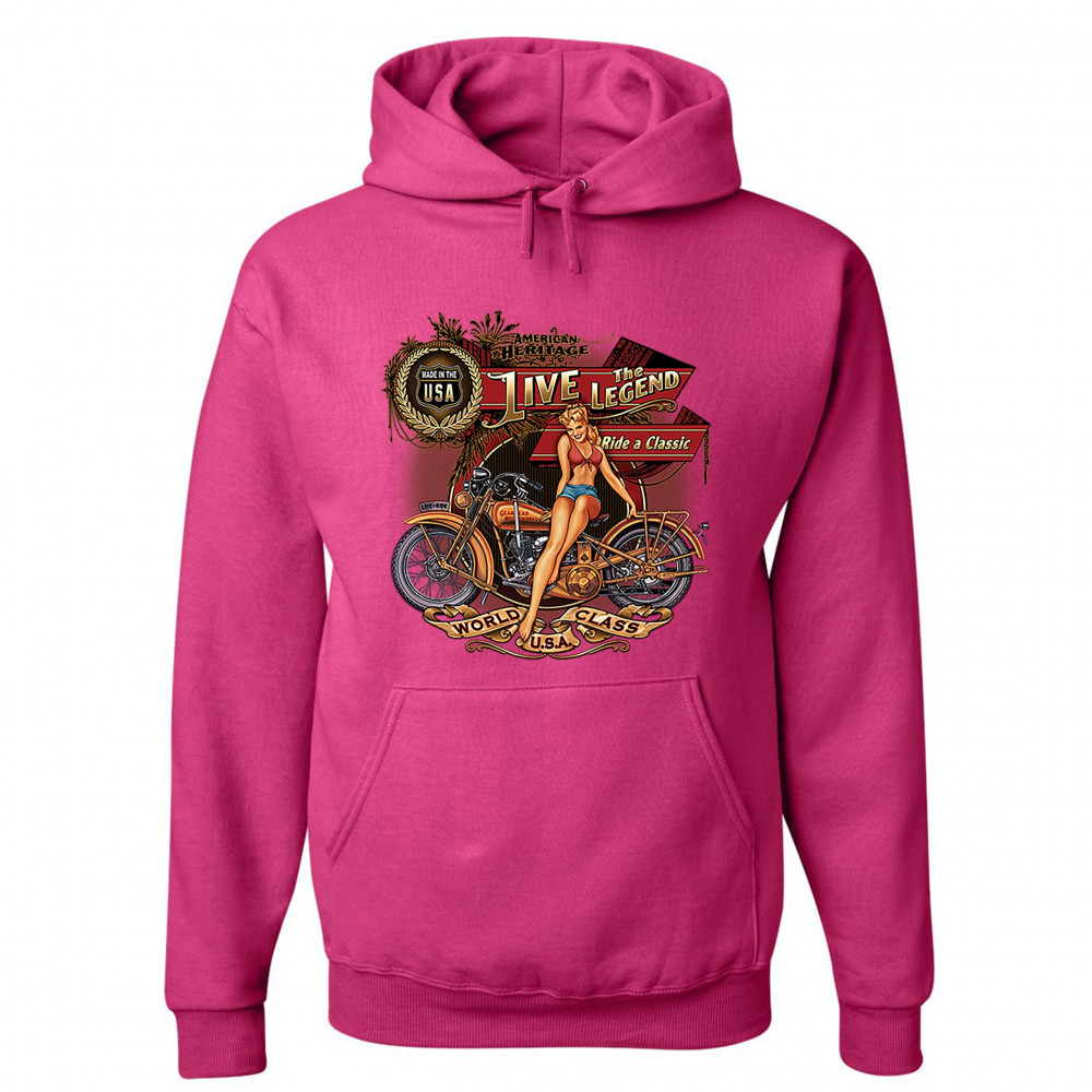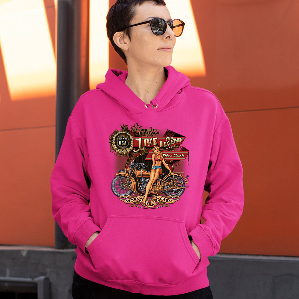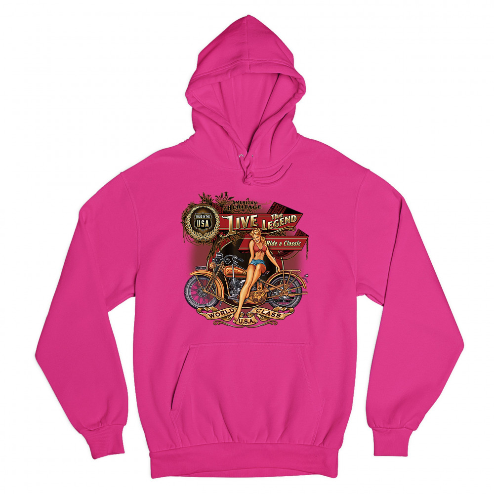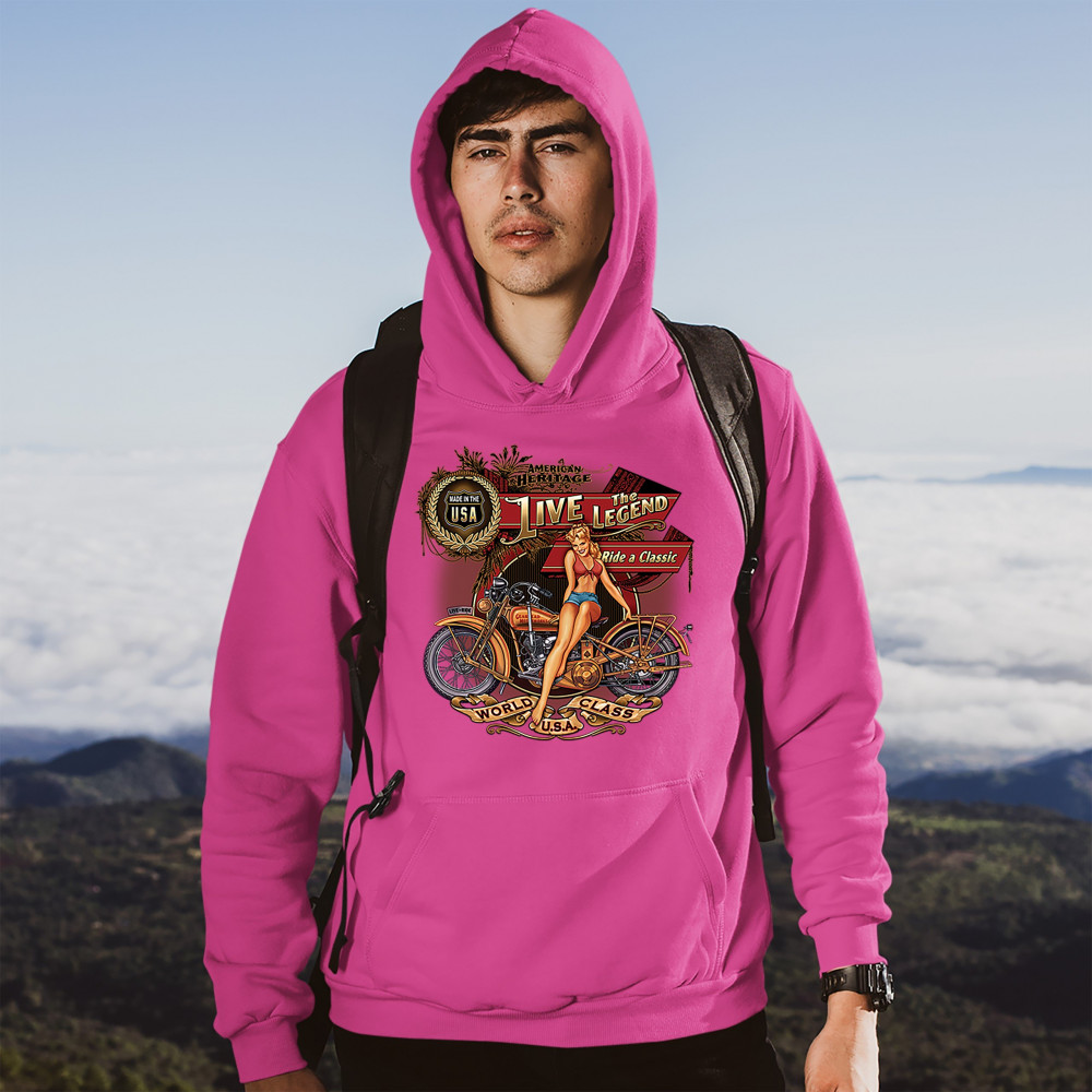 A print featuring a vintage motorcycle with a sexy girl sitting on top of it. On multiple stripes or signs the print says: "American Heritage, Made in the USA, Live the Legend, Ride a Classic, Live to Ride, World Class U.S.A." A great choice for a motorcy