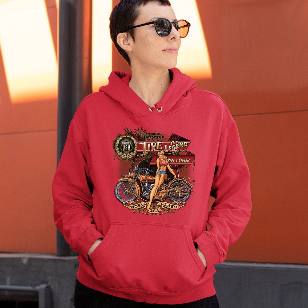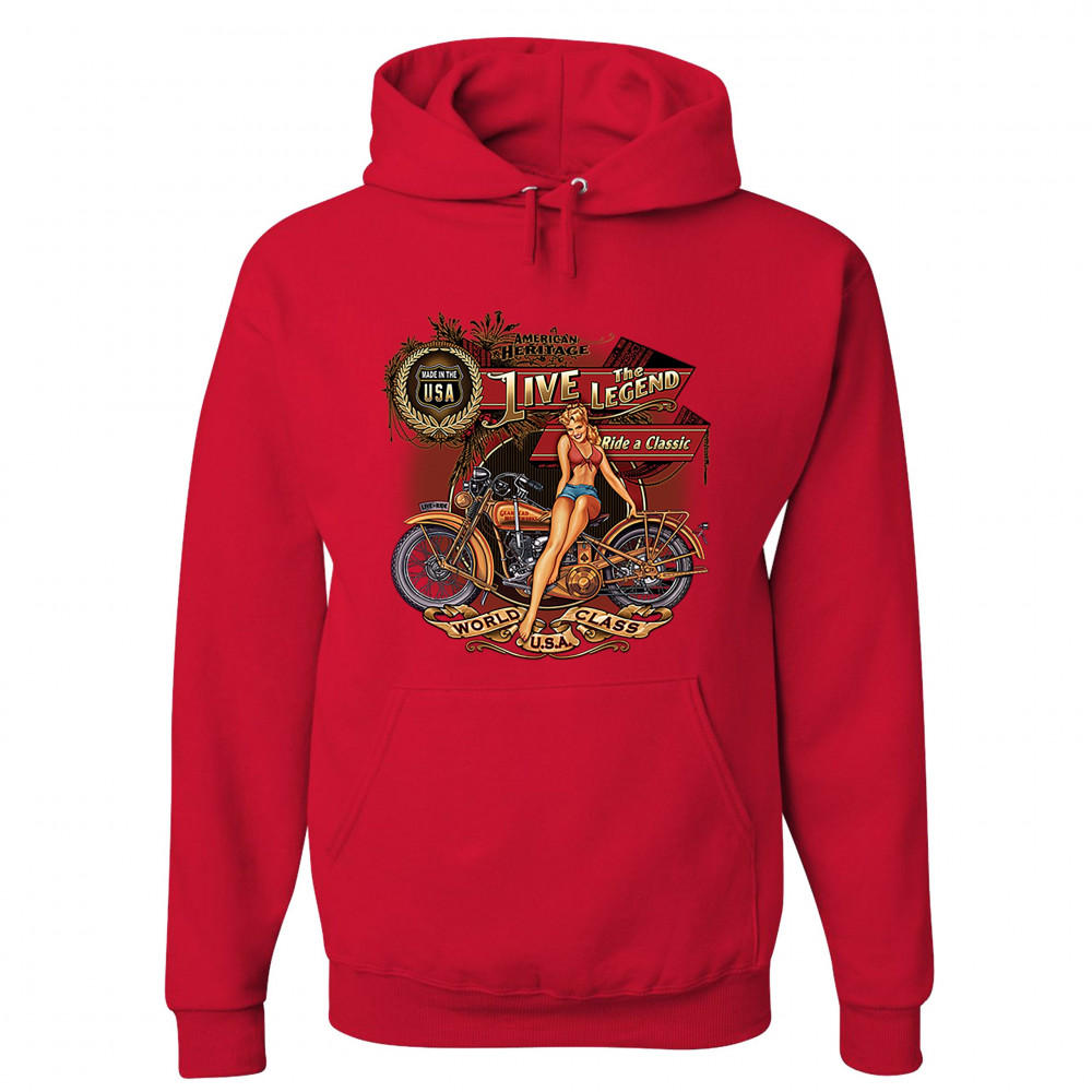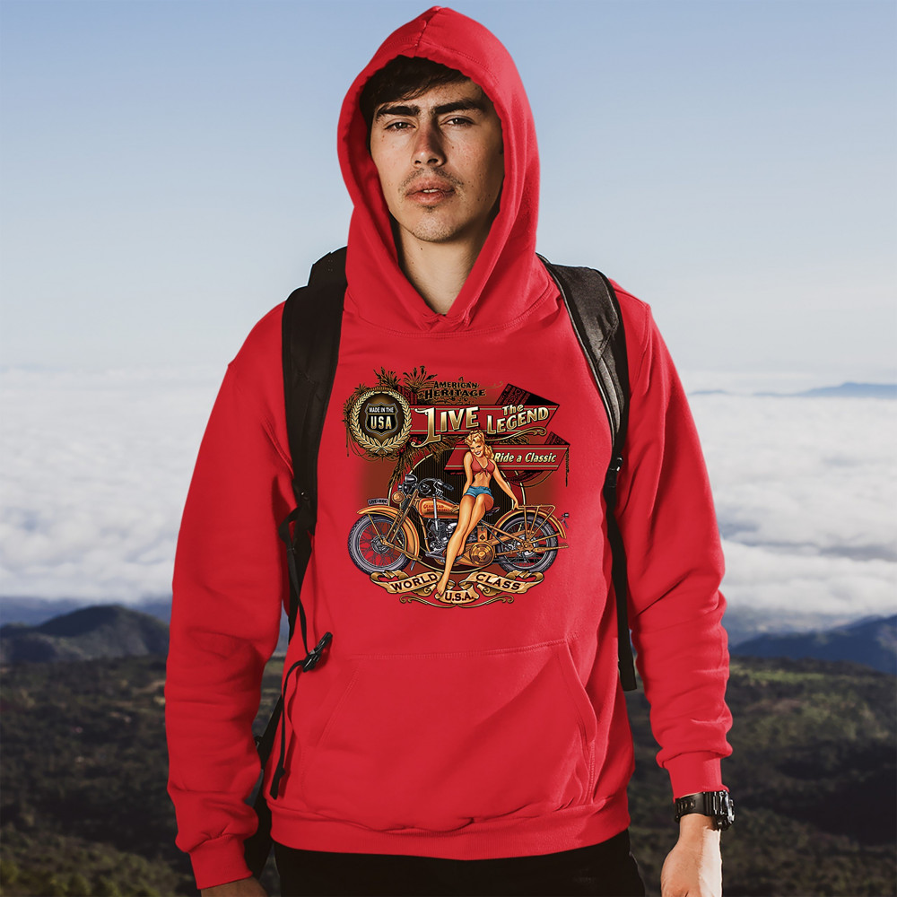A print featuring a vintage motorcycle with a sexy girl sitting on top of it. On multiple stripes or signs the print says: "American Heritage, Made in the USA, Live the Legend, Ride a Classic, Live to Ride, World Class U.S.A." A great choice for a motorcy