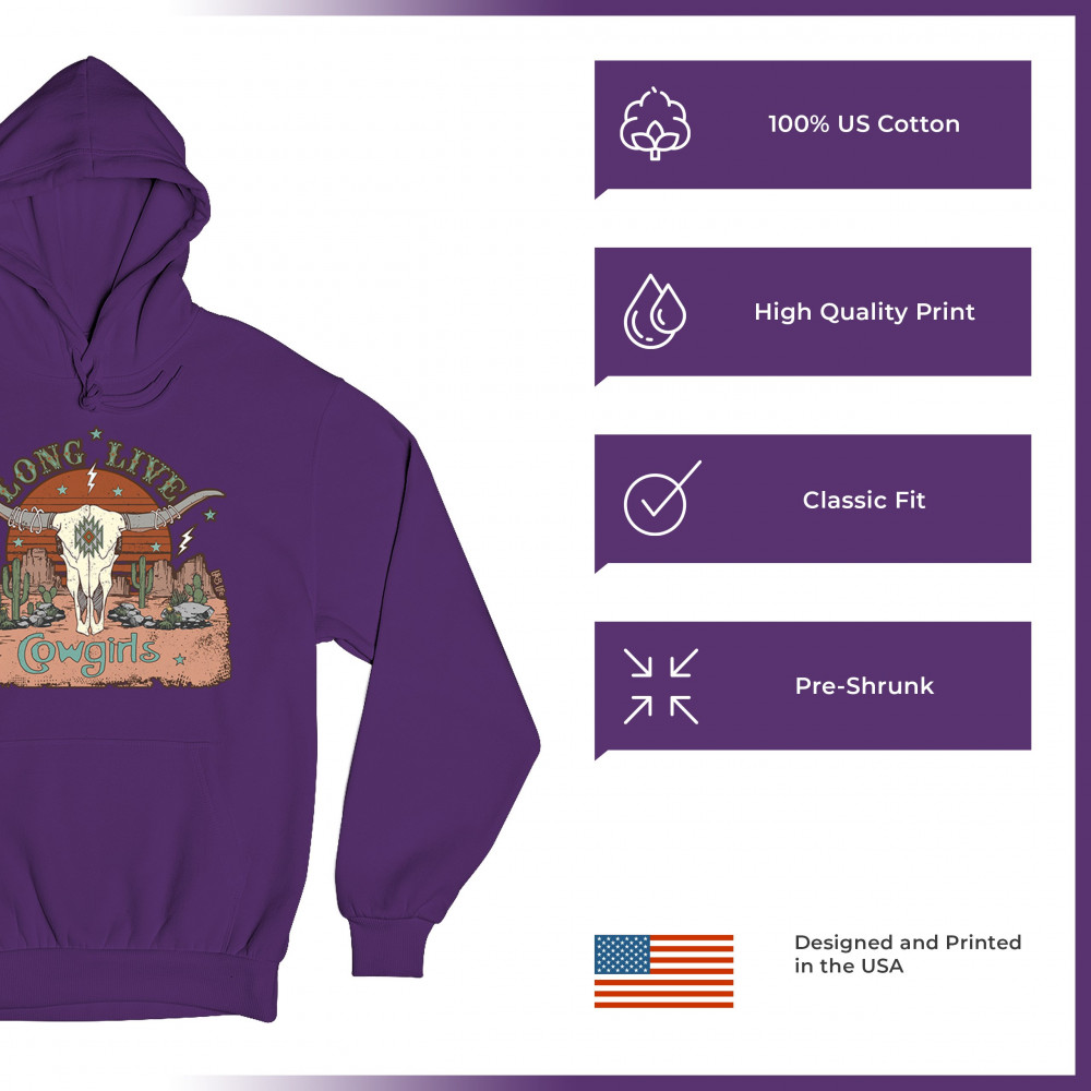 "Long Live Cowgirls" is more than a design; it's a celebration of the untamed heart of the west. This piece captures the essence of southwestern pride with its bold cow skull emblem and desert landscape, evoking the free spirit of the cowgirl way of life. It's an homage to the grit and grace of western women, a timeless piece to honor the legacy that cowgirls have carved into the American narrative. Let it bring the spirit of the wild west to your home.