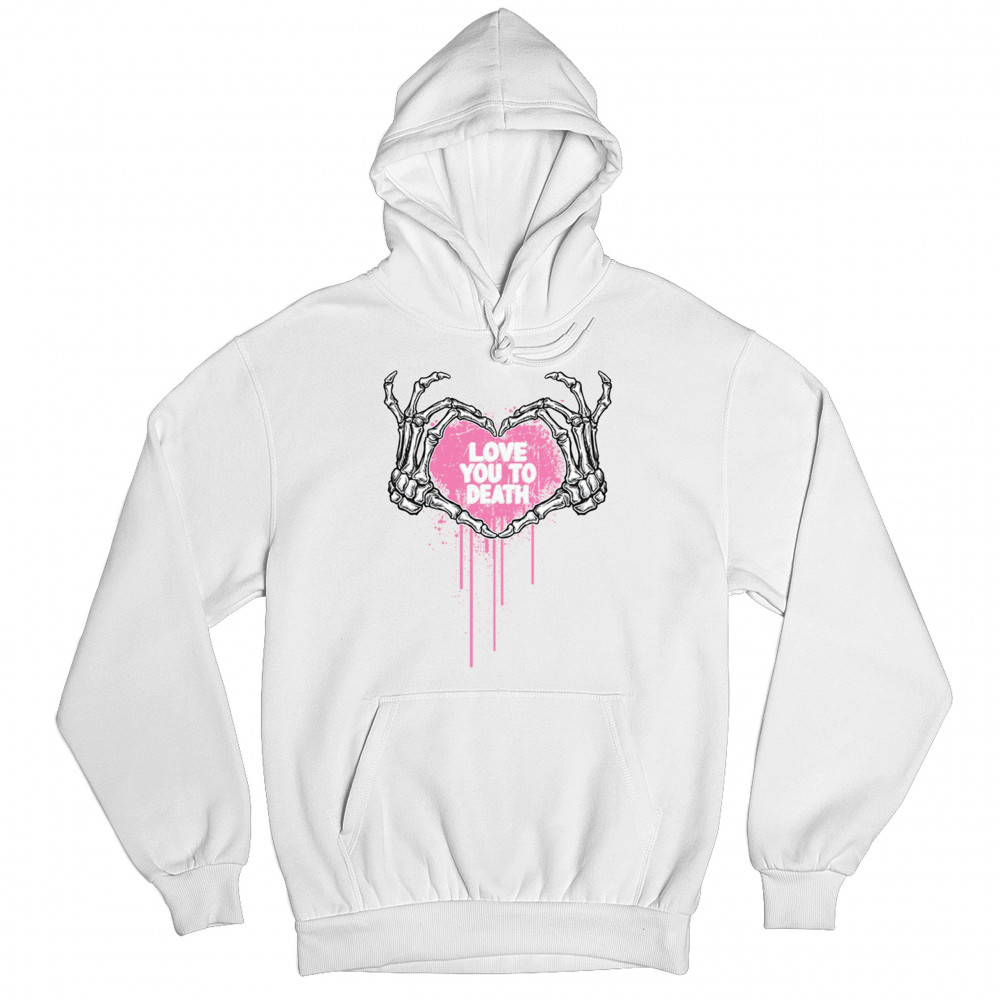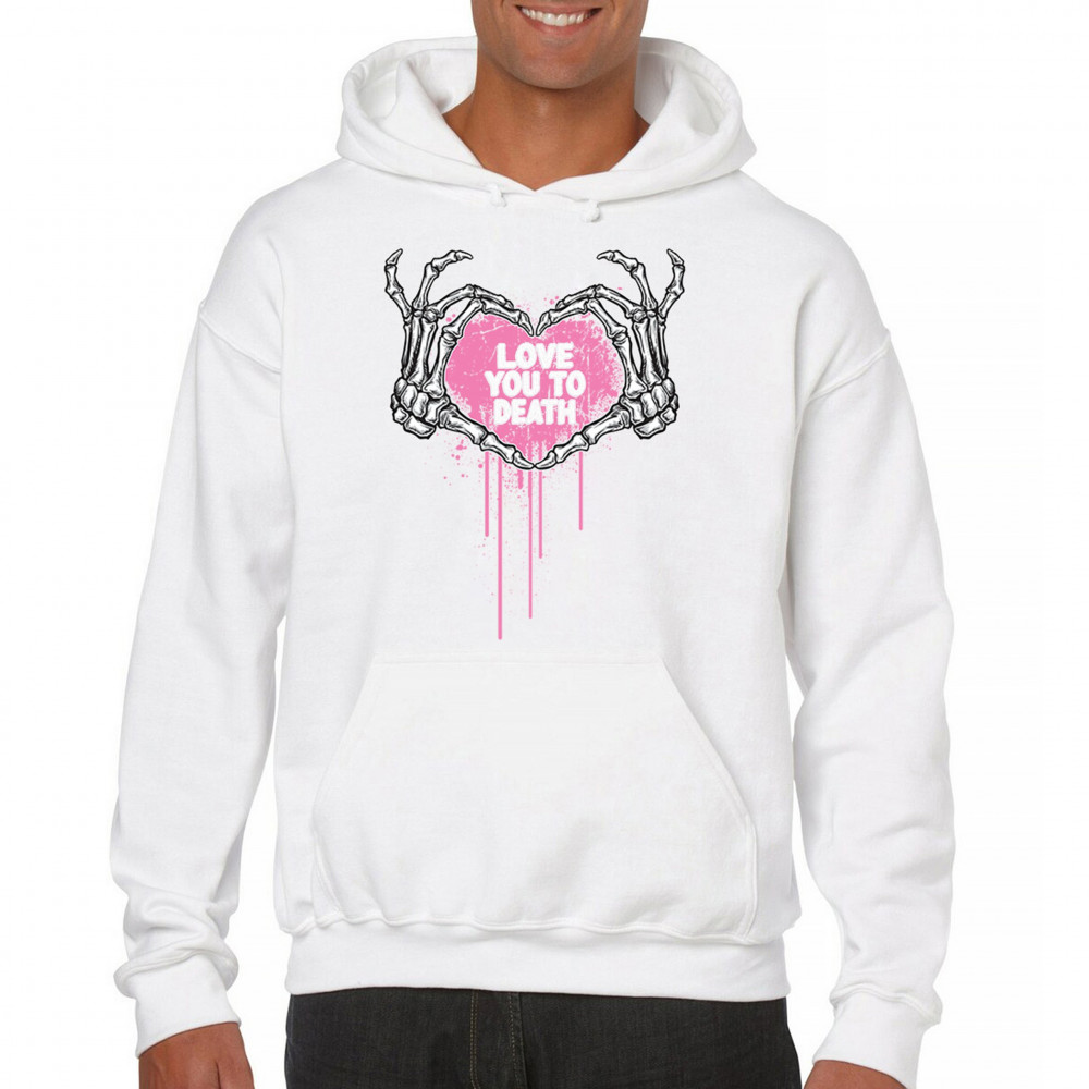 Show your spooky side with this skeleton hands heart design featuring a pink background and the phrase "Love You to Death." A perfect piece for alternative couples, Halloween lovers, and romantic rebels who embrace both affection and dark humor. Great for spooky season, date nights, and alt fashion outfits.