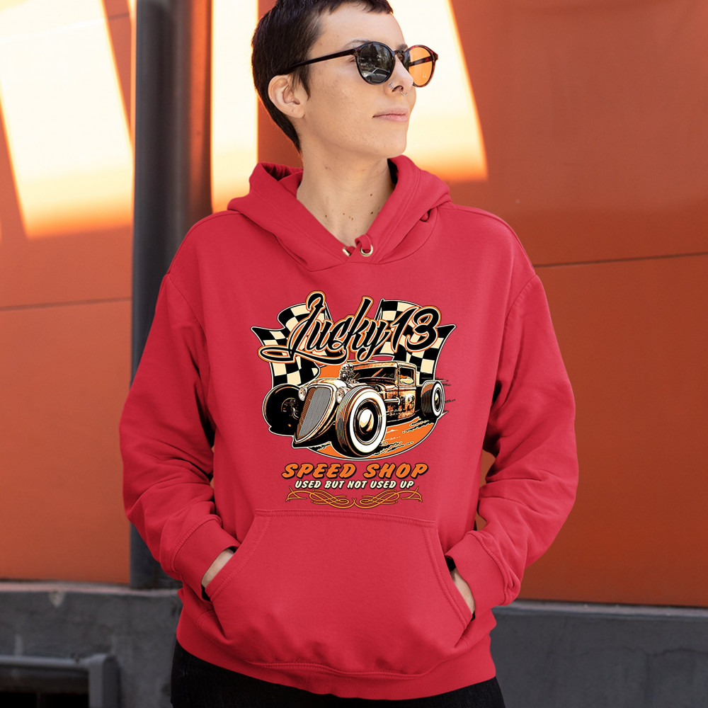 LUCKY 13 SPEED SHOP sweatshirt rat rod route 66 vintage racing car hoodie red