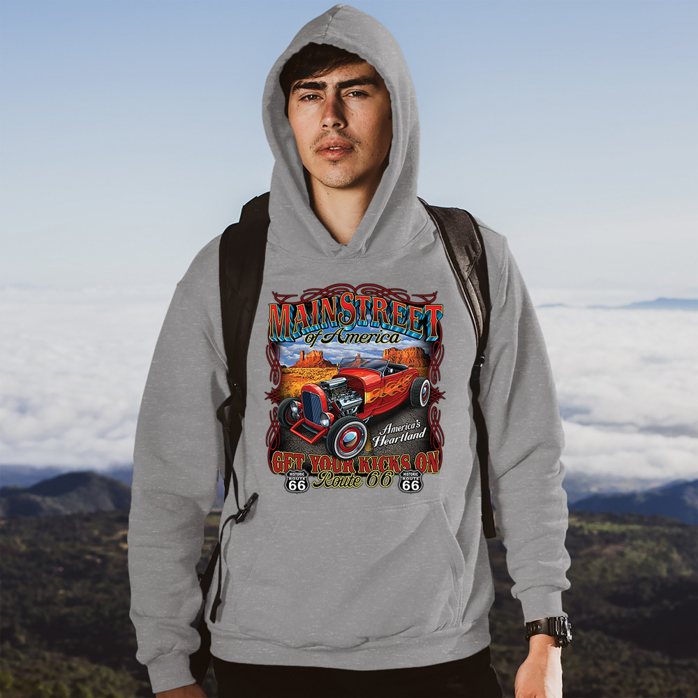 A print featuring a vintage hot rod with an exposed engine and flame paint job parked on a highway. The print says: "Main Street of America", "America's Heartland" and "Get Your Kicks on Route 66". The print also features two Route 66 signs. A great choic