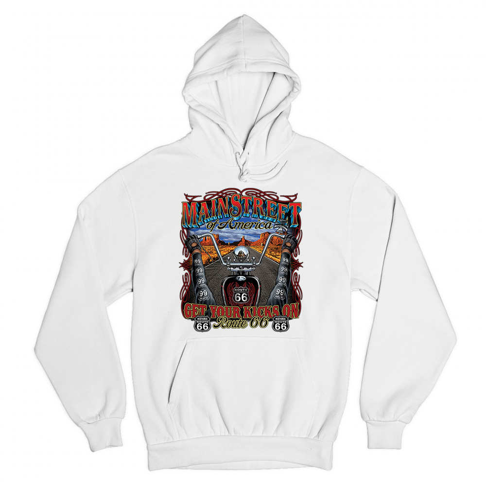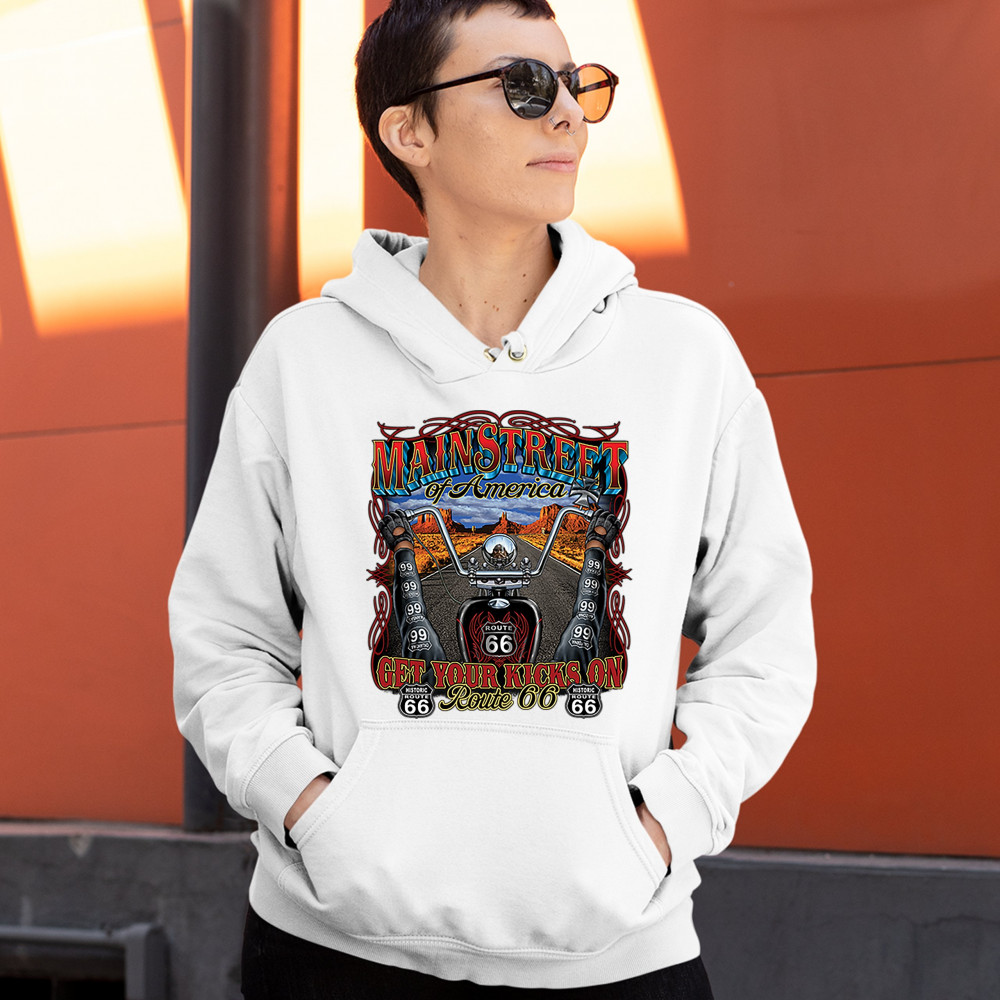 A print featuring a POV of a biker riding a chopper on a Route 66. There are are numerous "Route 66" and "Historic Route 66" signs all over the print and the print says: "Main street of America" and "Gwt your kicks on Route 66". A great choice for a motor