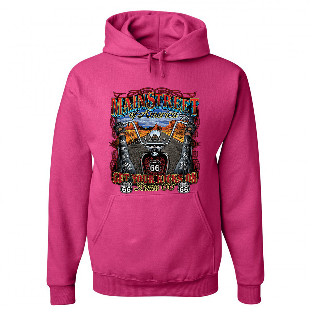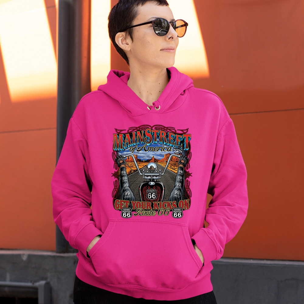 A print featuring a POV of a biker riding a chopper on a Route 66. There are are numerous "Route 66" and "Historic Route 66" signs all over the print and the print says: "Main street of America" and "Gwt your kicks on Route 66". A great choice for a motor