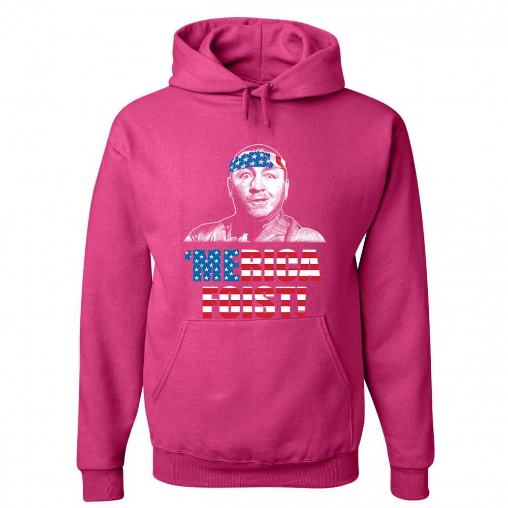 A funny patriotic print saying: "'Merica Foist" and depicting grinning Curly Howard wearing an American flag bandana. The words are decorated with the Stars and Stripes of the American flag. A great gift for anyone who is a fan of the legendary TV show.