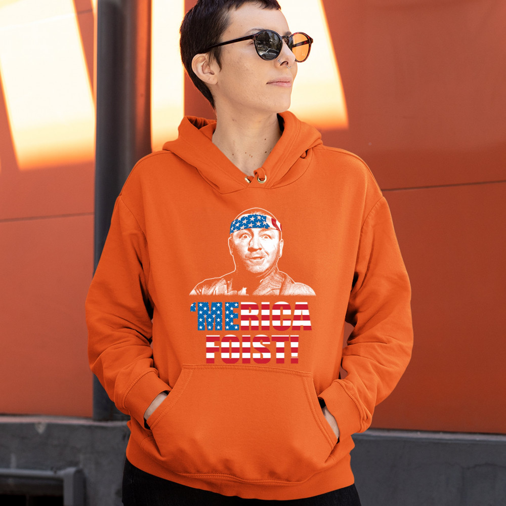 A funny patriotic print saying: "'Merica Foist" and depicting grinning Curly Howard wearing an American flag bandana. The words are decorated with the Stars and Stripes of the American flag. A great gift for anyone who is a fan of the legendary TV show.