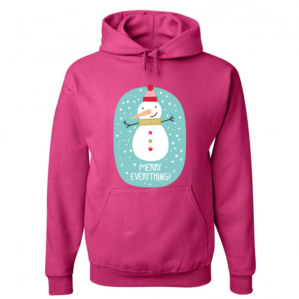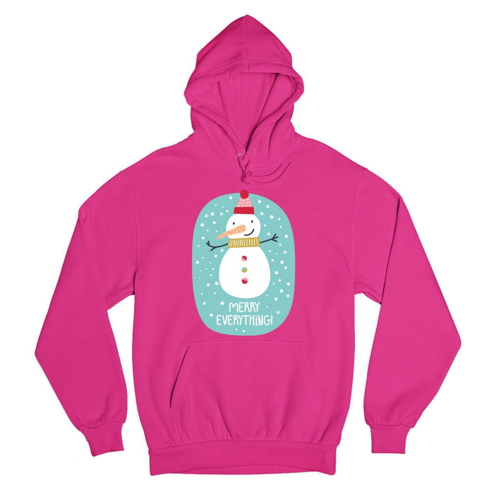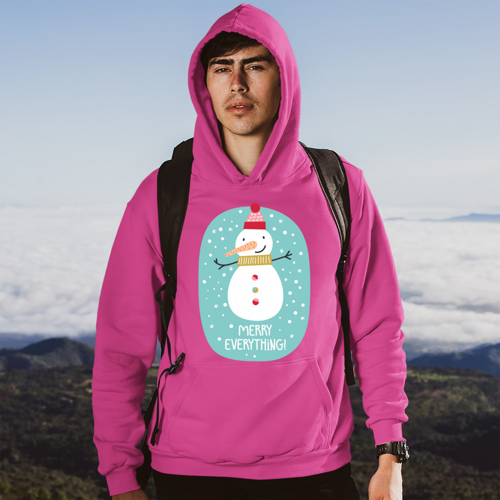 A print featuring a happy snowman with a carrot nose wearing a hat and a scarf smiling and spreading it's hands. It is snowing and below the snowman it says: "Merry Christmas". Amazing choice to make people smile and spread positive vibes on Christmas Eve