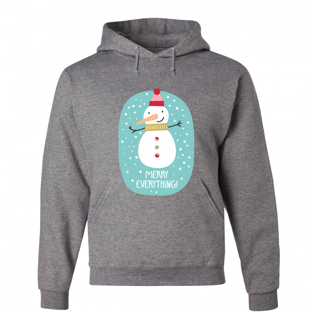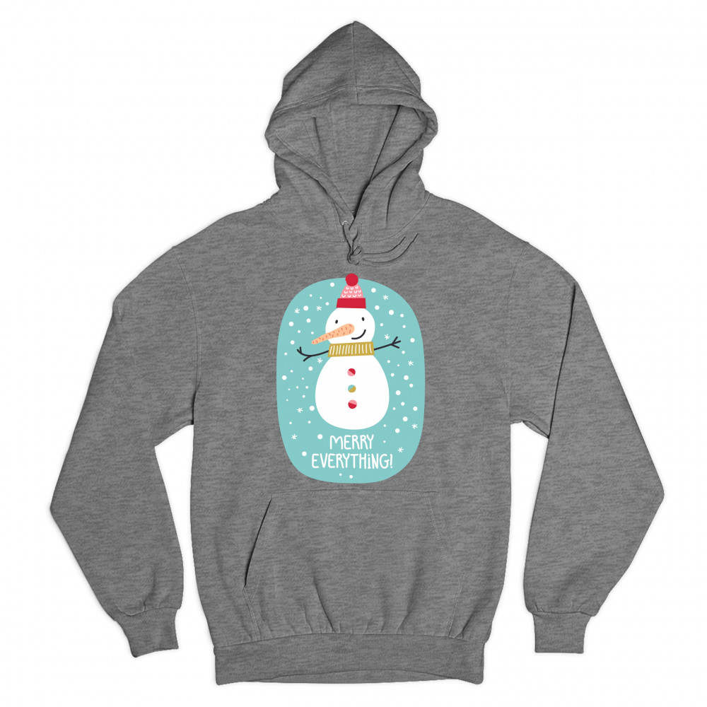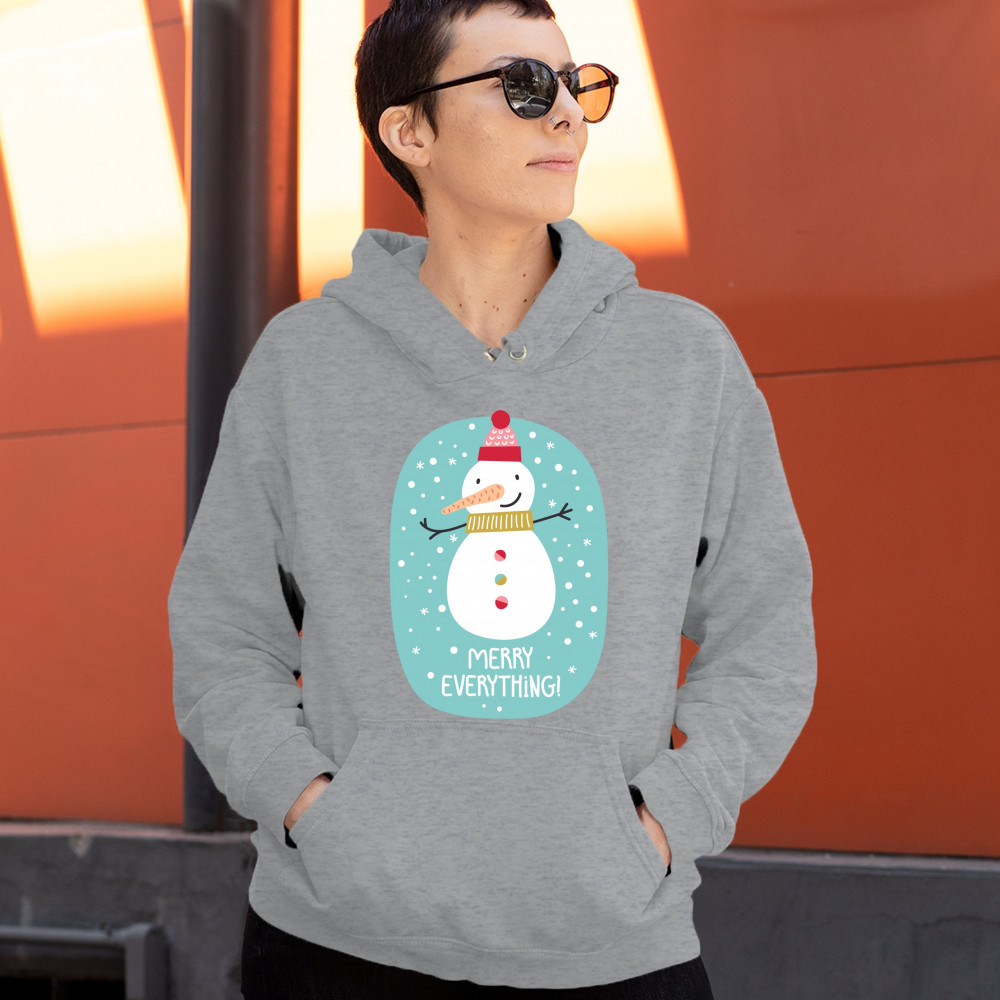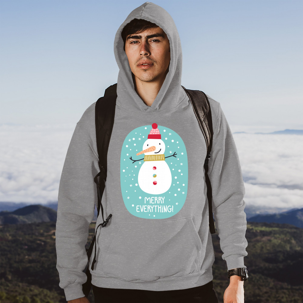 A print featuring a happy snowman with a carrot nose wearing a hat and a scarf smiling and spreading it's hands. It is snowing and below the snowman it says: "Merry Christmas". Amazing choice to make people smile and spread positive vibes on Christmas Eve