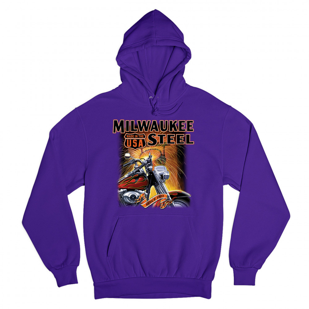 A print featuring a motorcycle in the front and a melting furnace in the background with sparkles flying all over the place. The print says: "Milwaukee Steel". There is also a sign that says "made in the USA" and a stripe with "since 1903" written on it.