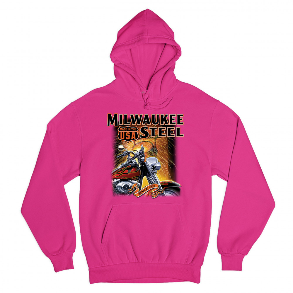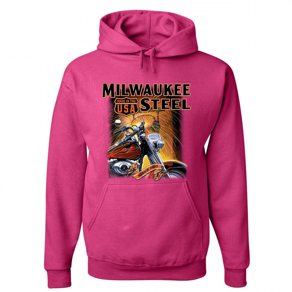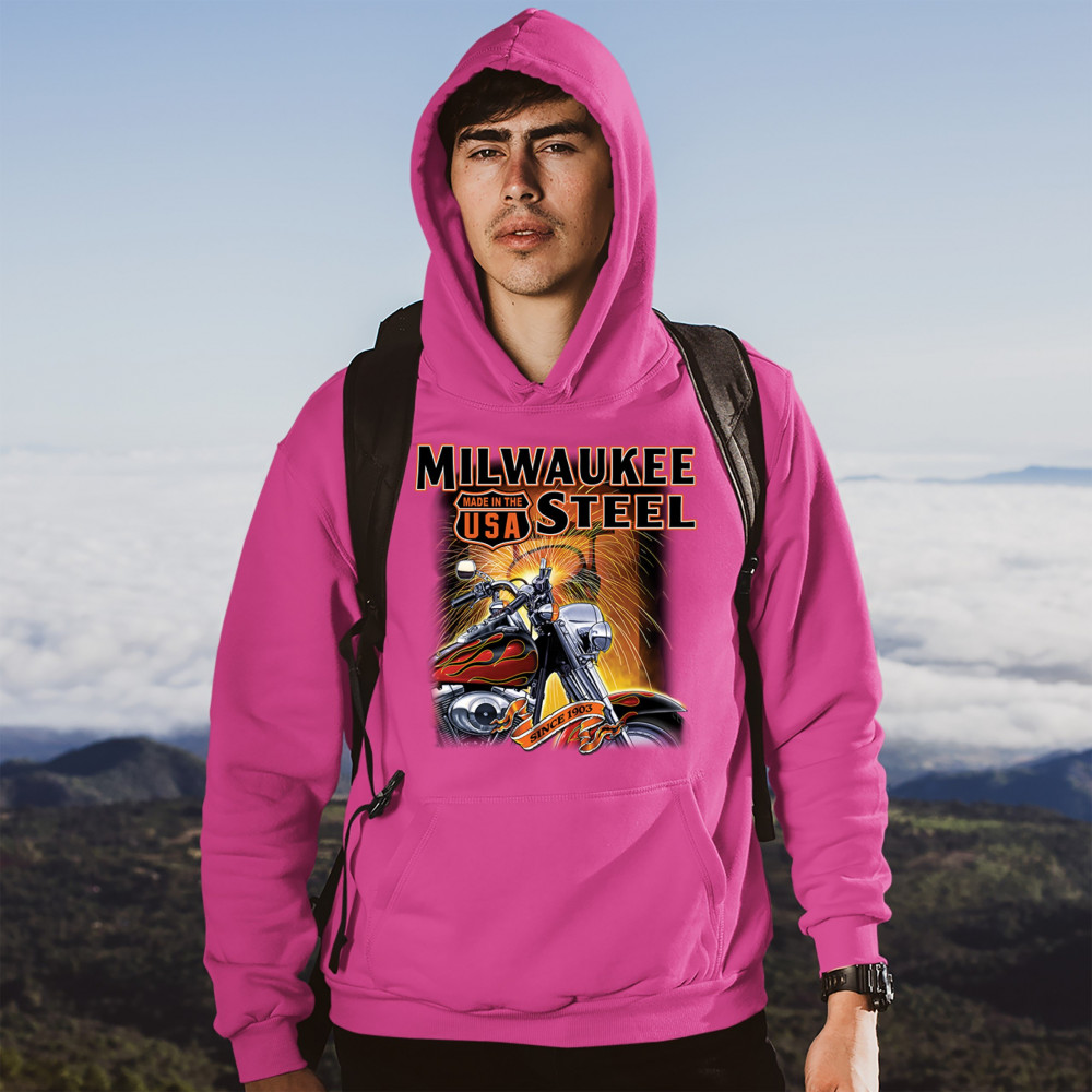 A print featuring a motorcycle in the front and a melting furnace in the background with sparkles flying all over the place. The print says: "Milwaukee Steel". There is also a sign that says "made in the USA" and a stripe with "since 1903" written on it.