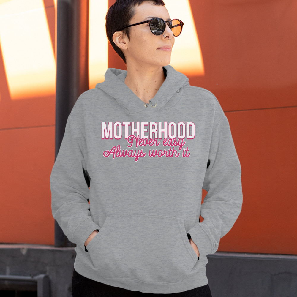 MOTHERHOOD NEVER EASY ALWAYS WORTH IT sweatshirt mother's day mom hoodie gray