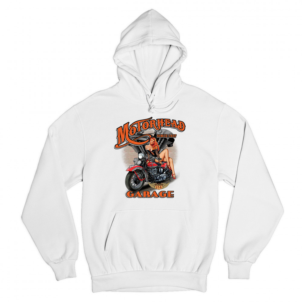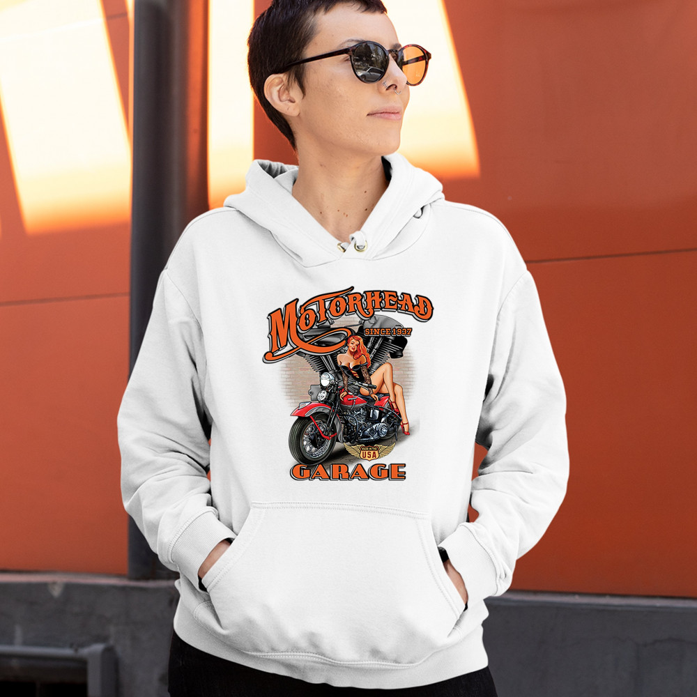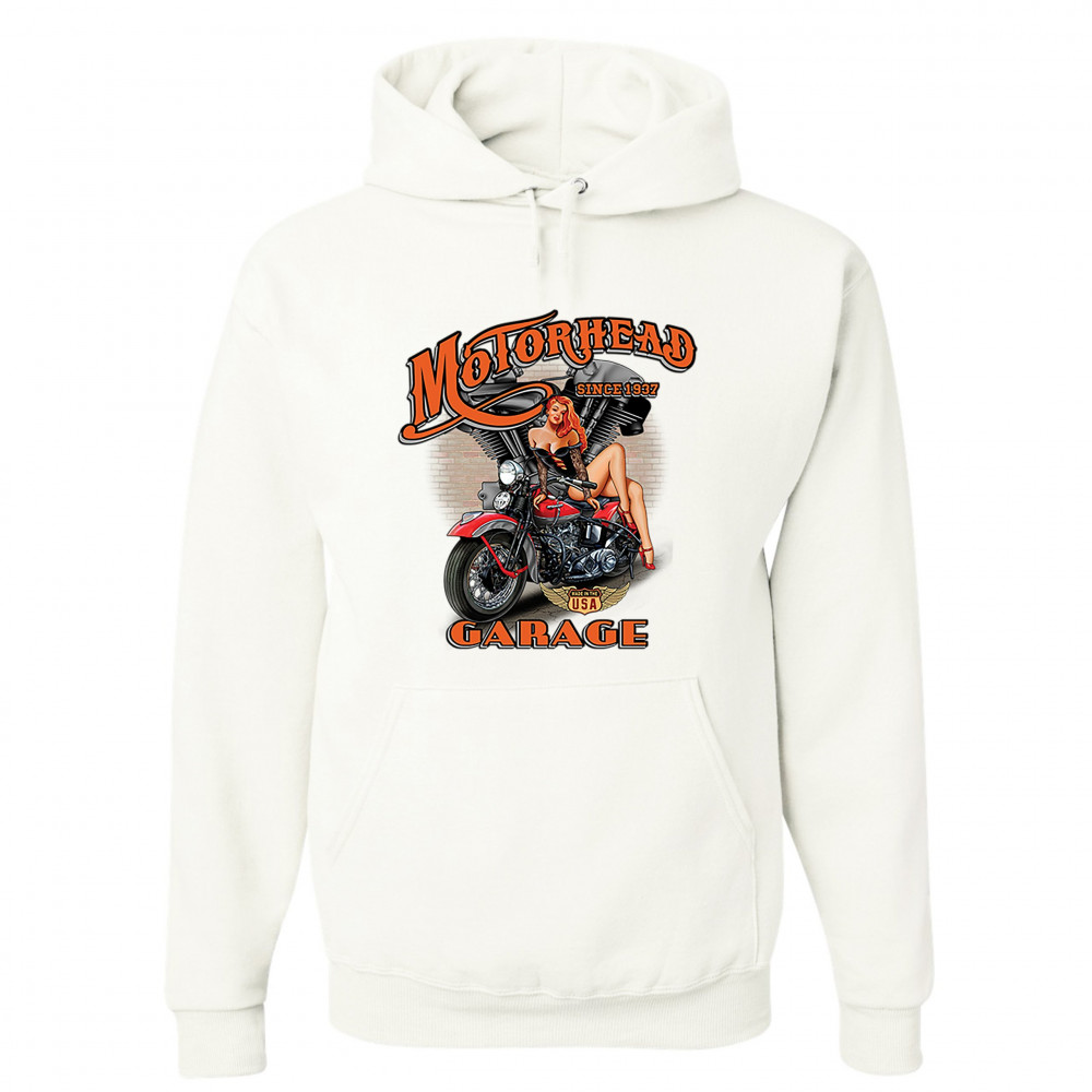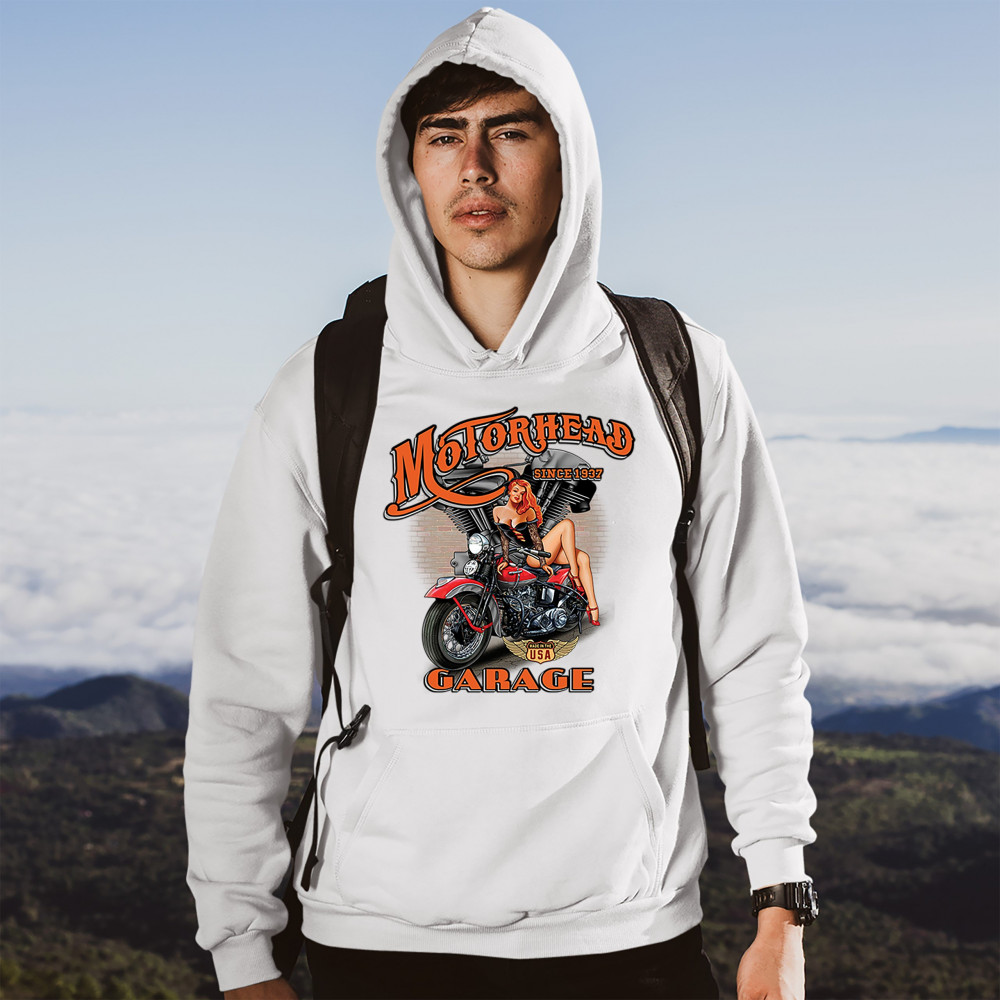 A print featuring a sexy pin-up girl sitting on a motorcycle. In the background there is a motorcycle engine and a brick wall. The print says: "Motorhead Garage since 1937" and features a "Made in the USA" sign. A great choice for a motorcycle enthusiast.