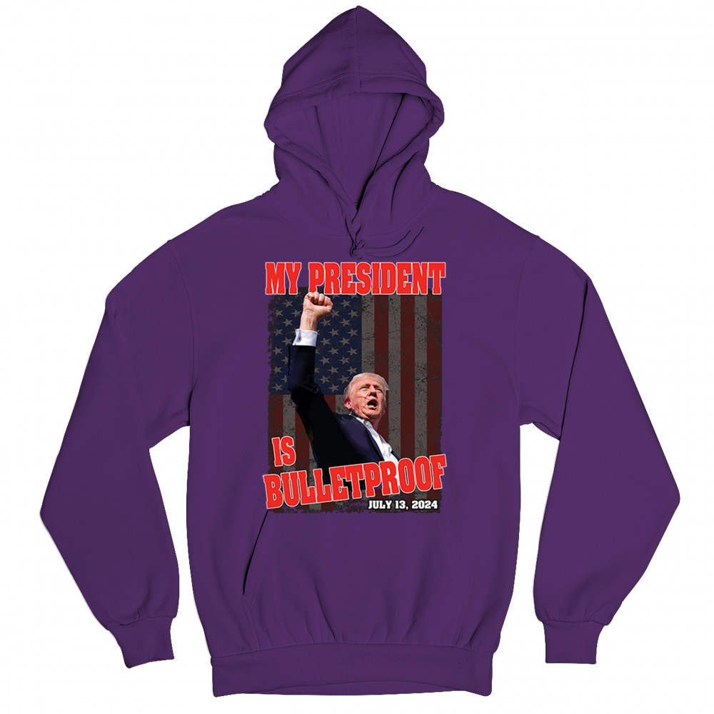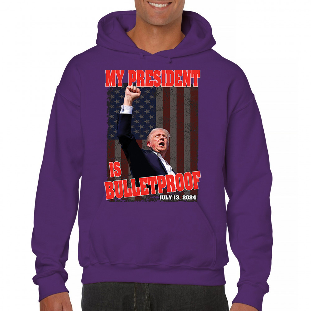 Support Trump with our "My President is Bulletproof" design, perfect for rallies and everyday wear. Show your patriotic pride and conservative values.