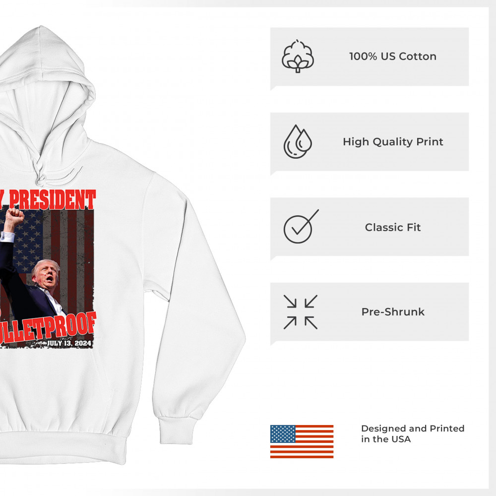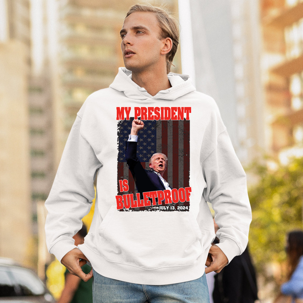 Support Trump with our "My President is Bulletproof" design, perfect for rallies and everyday wear. Show your patriotic pride and conservative values.