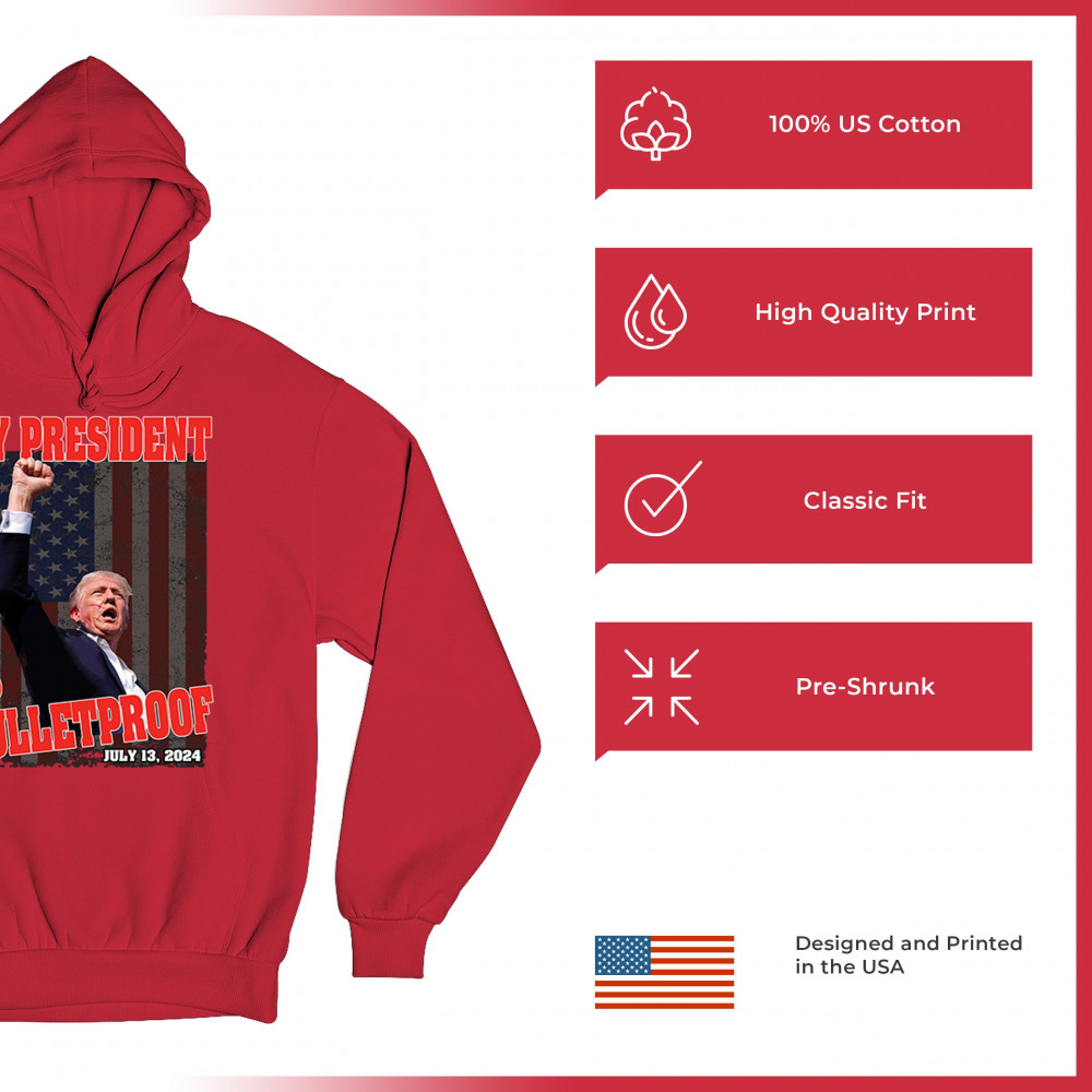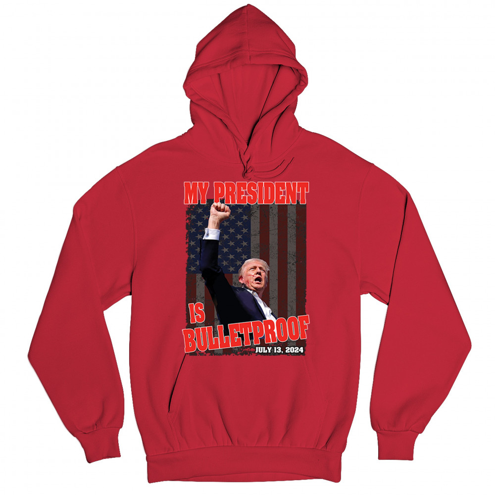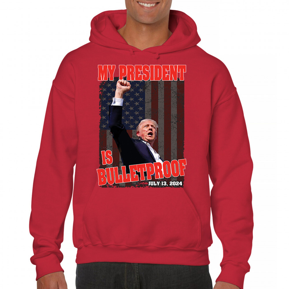 Support Trump with our "My President is Bulletproof" design, perfect for rallies and everyday wear. Show your patriotic pride and conservative values.