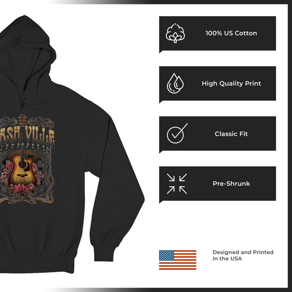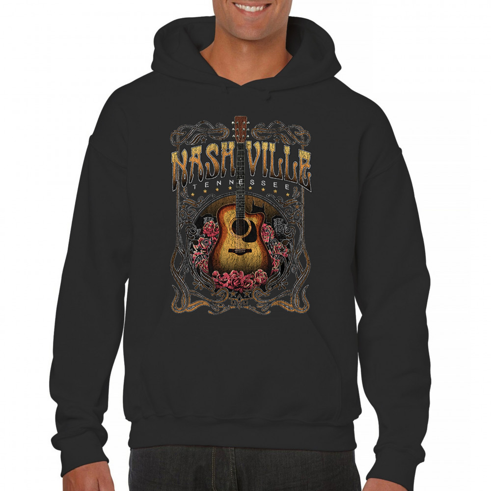 Vintage Nashville Tennessee design with rustic guitar and roses. Great for concerts, country music fans, road trips, and souvenir wear.