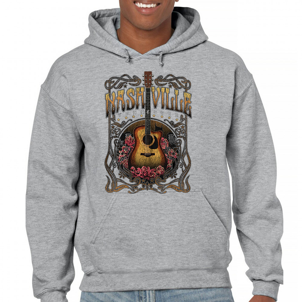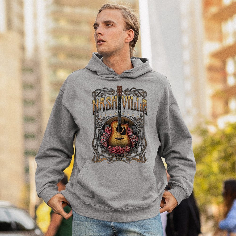 Vintage Nashville Tennessee design with rustic guitar and roses. Great for concerts, country music fans, road trips, and souvenir wear.