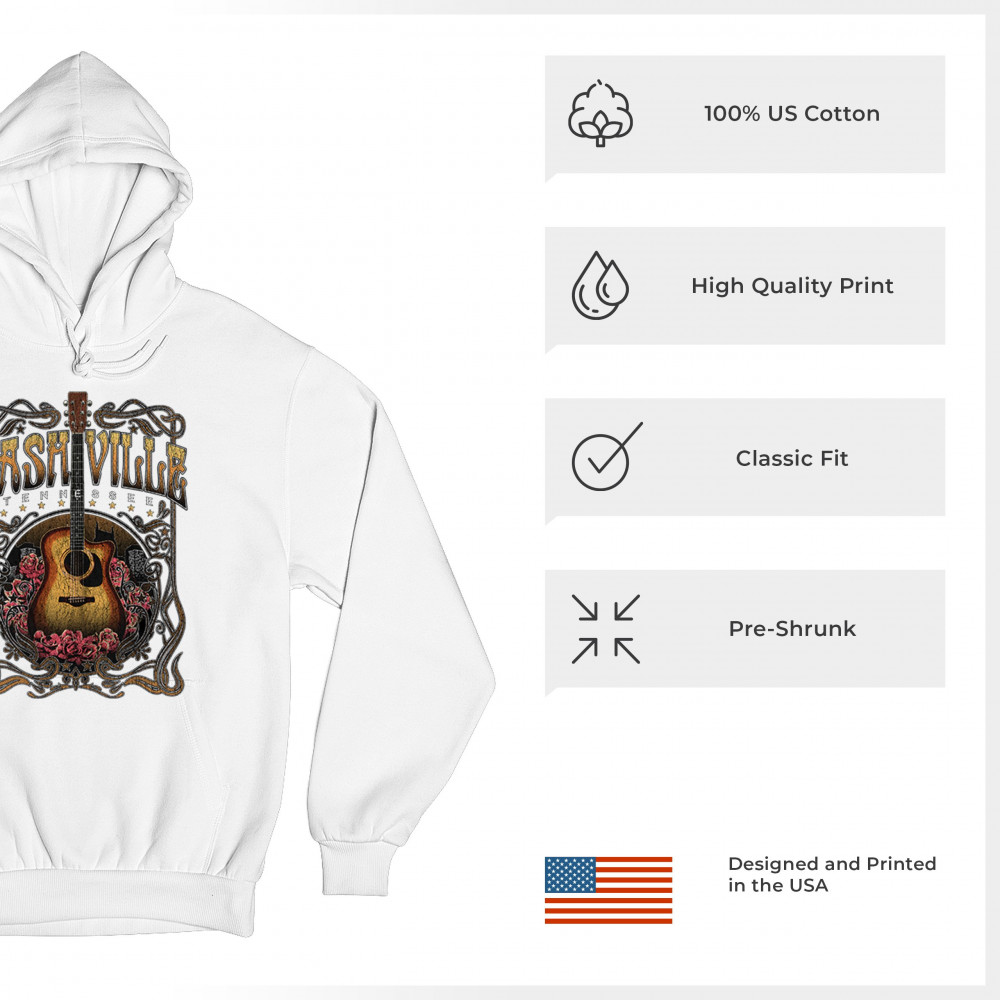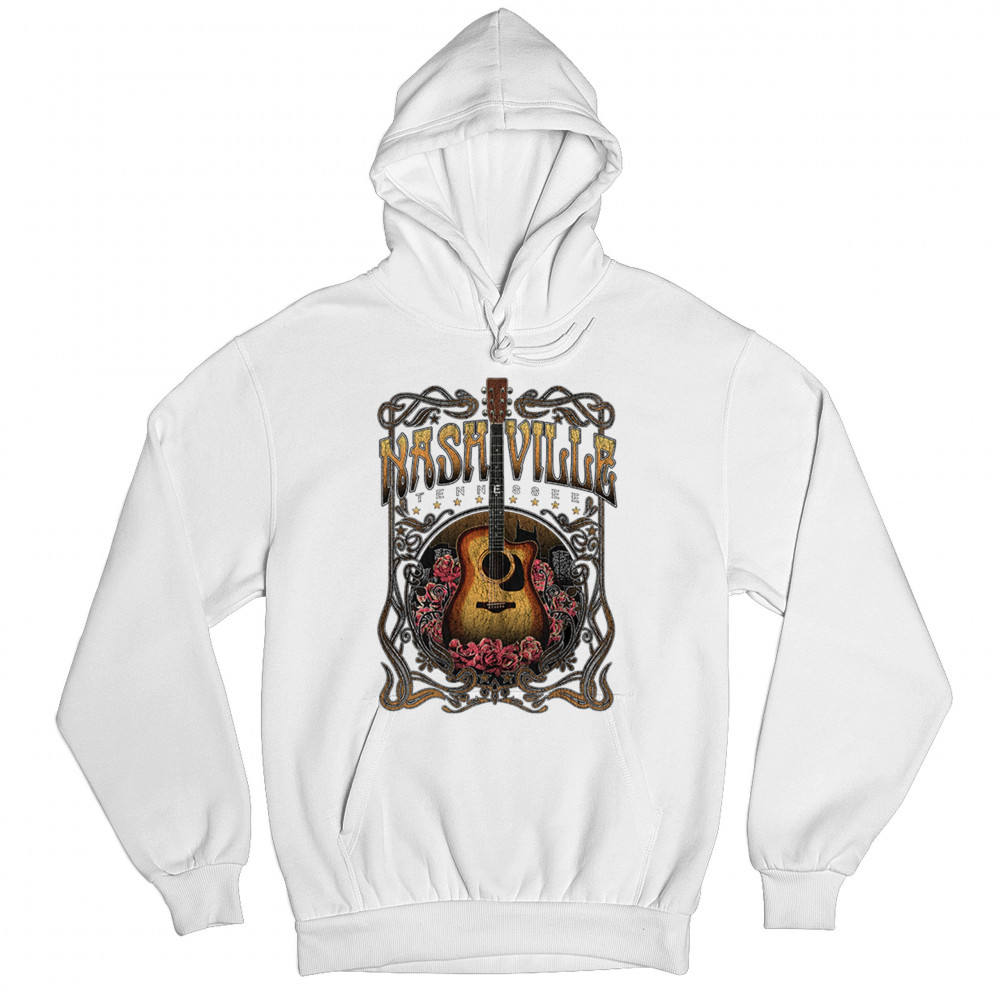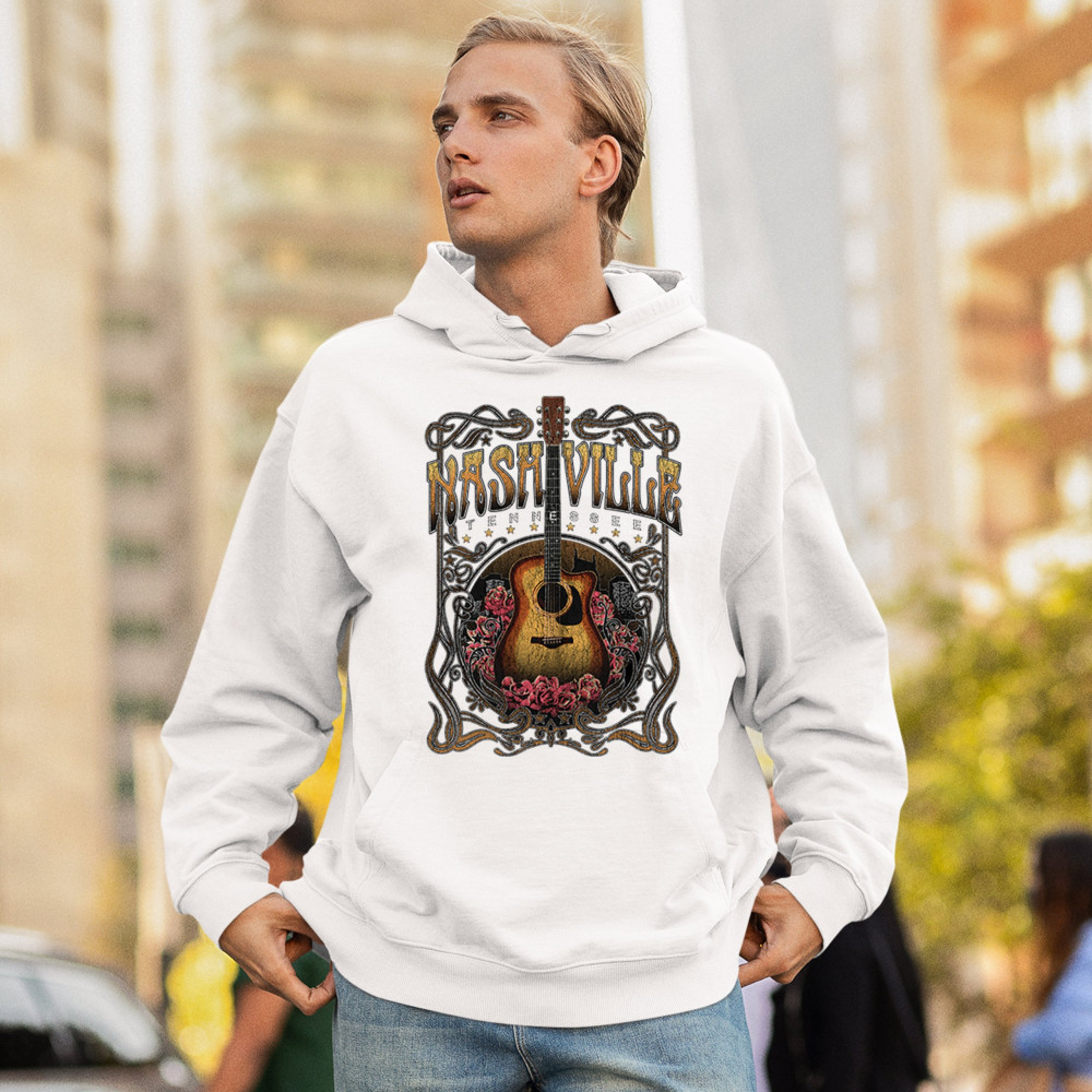 Vintage Nashville Tennessee design with rustic guitar and roses. Great for concerts, country music fans, road trips, and souvenir wear.