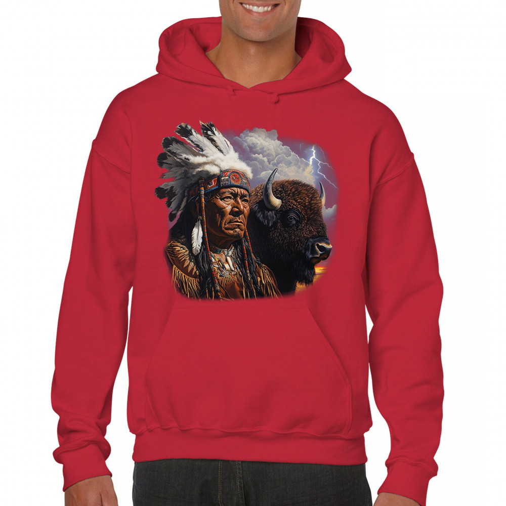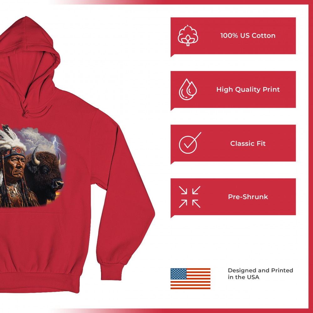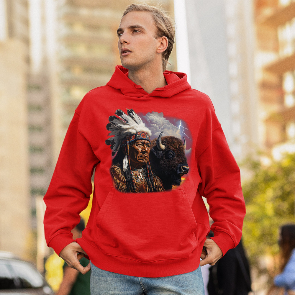 Bold tribal elder and bison design framed by lightning sky—honoring heritage, strength, resilience, and sacred connection to nature.