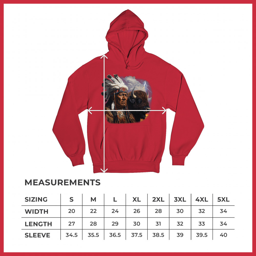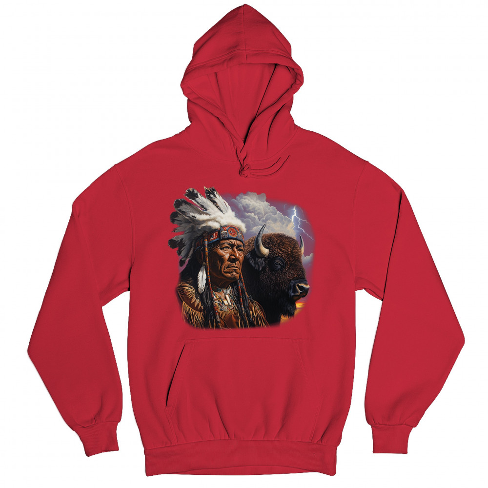 This powerful design features a Native American elder in traditional dress and feathered headdress beside a noble bison. Framed by a stormy sky and lightning, the art symbolizes tribal pride, spiritual harmony, ancestral strength, and a deep connection to nature’s raw energy.